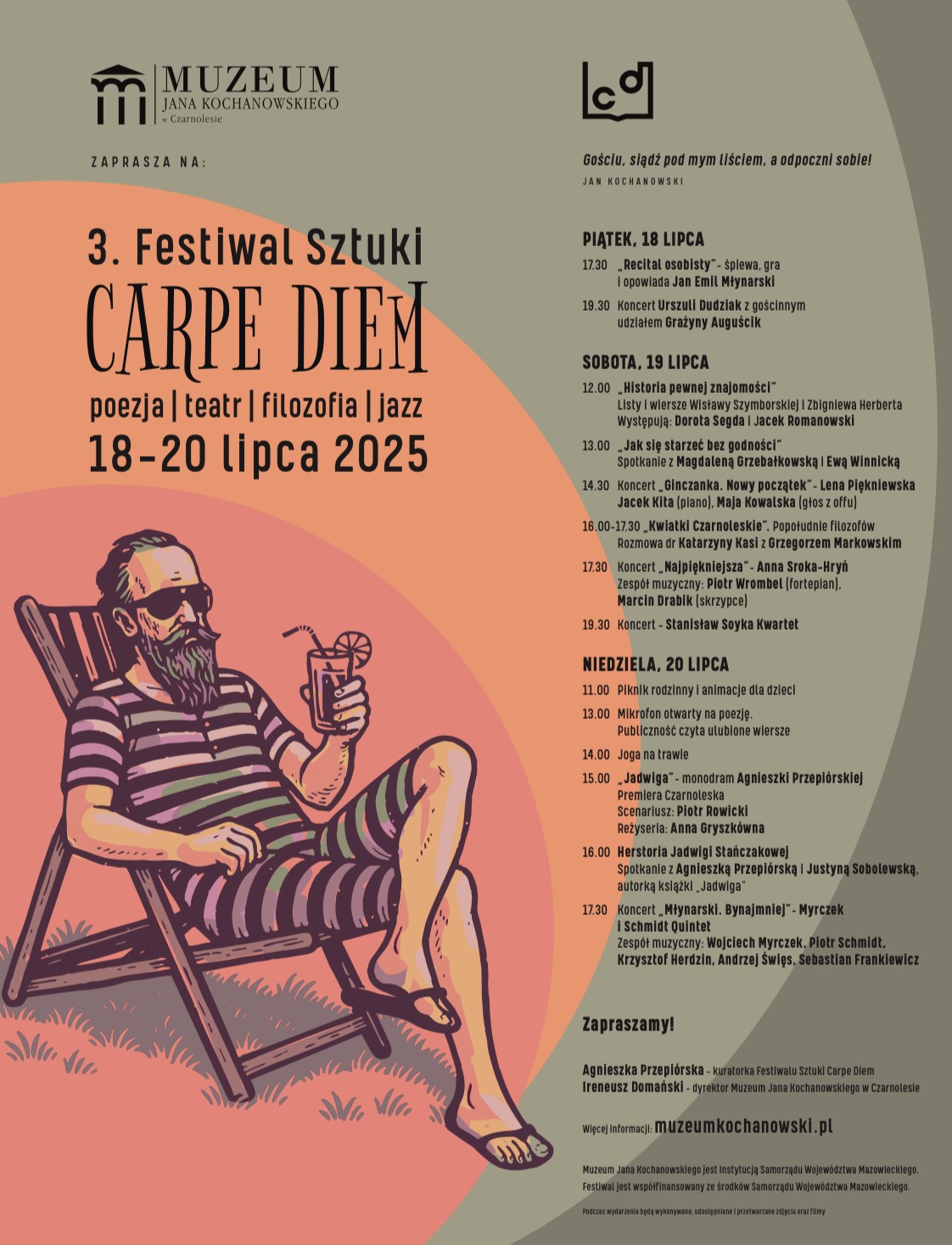 W dniach 18 – 20 lipca na terenie Muzeum Jana Kochanowskiego w Czarnolesie odbędzie się 3. edycja Festiwalu Sztuki CARPE DIEM. Poezja. Teatr. Filozofia. Jazz. W programie m.in. spektakle teatralne, koncerty jazzowe, spotkanie filozoficzne, czytanie poezji, animacje dla dzieci i piknik rodzinny pod lipami. Na czarnoleskiej scenie pojawią się m.in. Urszula Dudziak, Grażyna Auguścik, Dorota Segda, Agnieszka Przepiórska, Stanisław Soyka, dr Katarzyna Kasia i Jan Emil Młynarski.