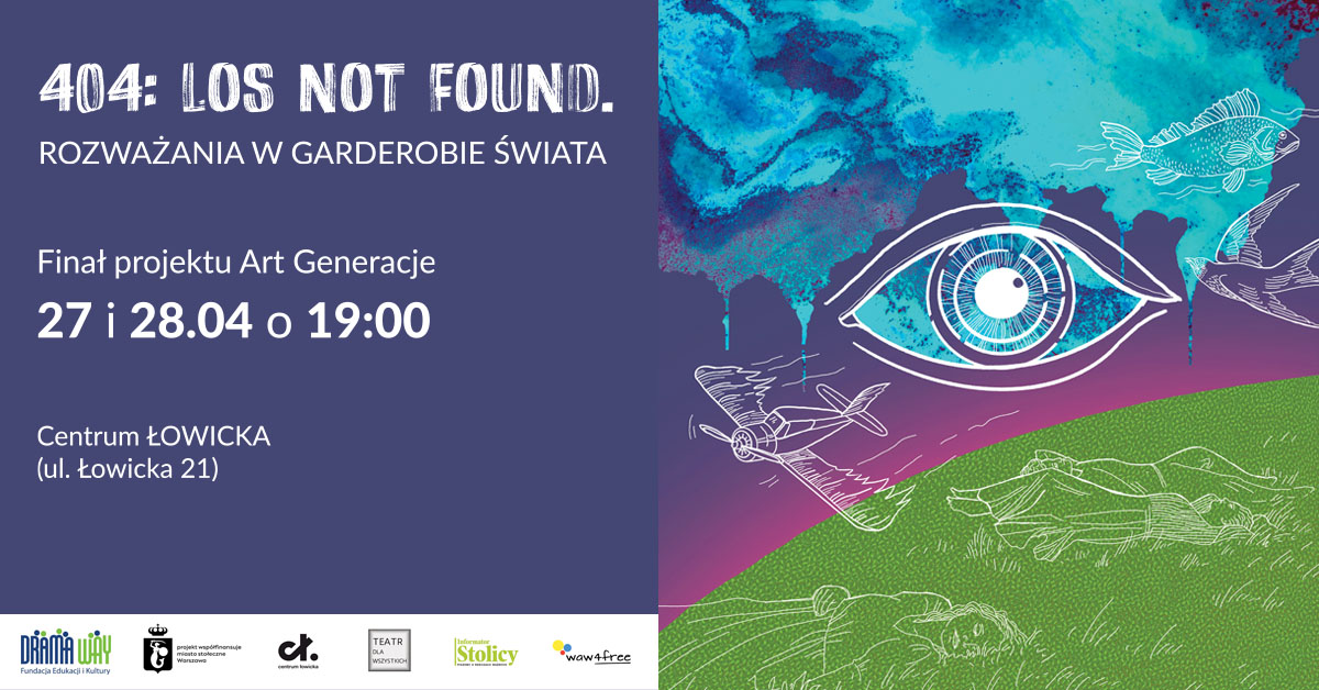 Drama Way Fundacja Edukacji i Kultury serdecznie zaprasza na spektakl „404: Los not found. Rozważania w garderobie świata” w reż. Adama Gąseckiego, który odbędzie się w ramach finału projektu Art Generacje. Spektakl jest owocem dwumiesięcznej pracy międzypokoleniowej grupy podczas której uczestnicy projektu zgłębiali istotę losu. Spektakle odbędą się 27 i 28 kwietnia o godz. 19:00 w Centrum ŁOWICKA na Starym Mokotowie. Wstęp wolny.