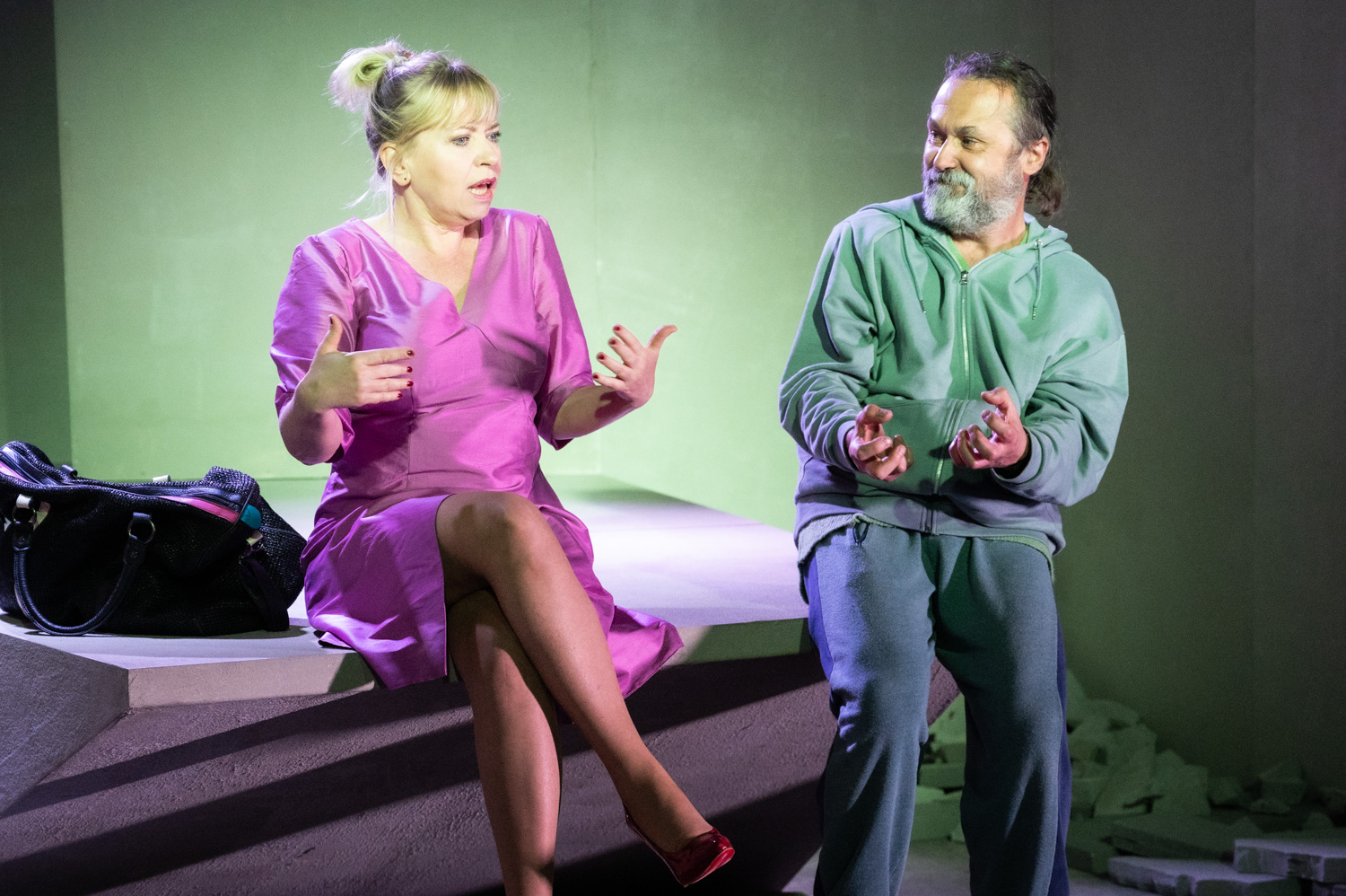 Jest Nowa Scena w Starym Teatrze, jest minimalistyczna scenografia – płytki chodnikowe i obok skały, urwisko; jest On (Zbigniew W. Kaleta), chwilę później pojawia się również Ona (Dorota Segda). Jest reżyserka – Ewa Kaim, która świetnie wiedziała co i w jaki sposób chce pokazać, jest wszakże jedną z ulubionych aktorek krakowskiej publiczności i reżyserką, pod której opieką studenci AST przygotowują przedstawienia dyplomowe i często osiągają po pierwsze zawodowe sukcesy (nie mogę się doczekać muzycznego, tak proszę Państwa!, muzycznego spektaklu Kwadrat, który zdobył Tukana Publiczności na Przeglądzie Piosenki Aktorskiej w 2021 roku; dzięki Ewie Kaim śpiewają w nim Stanisław Linowski i Łukasz Szczepanowski).