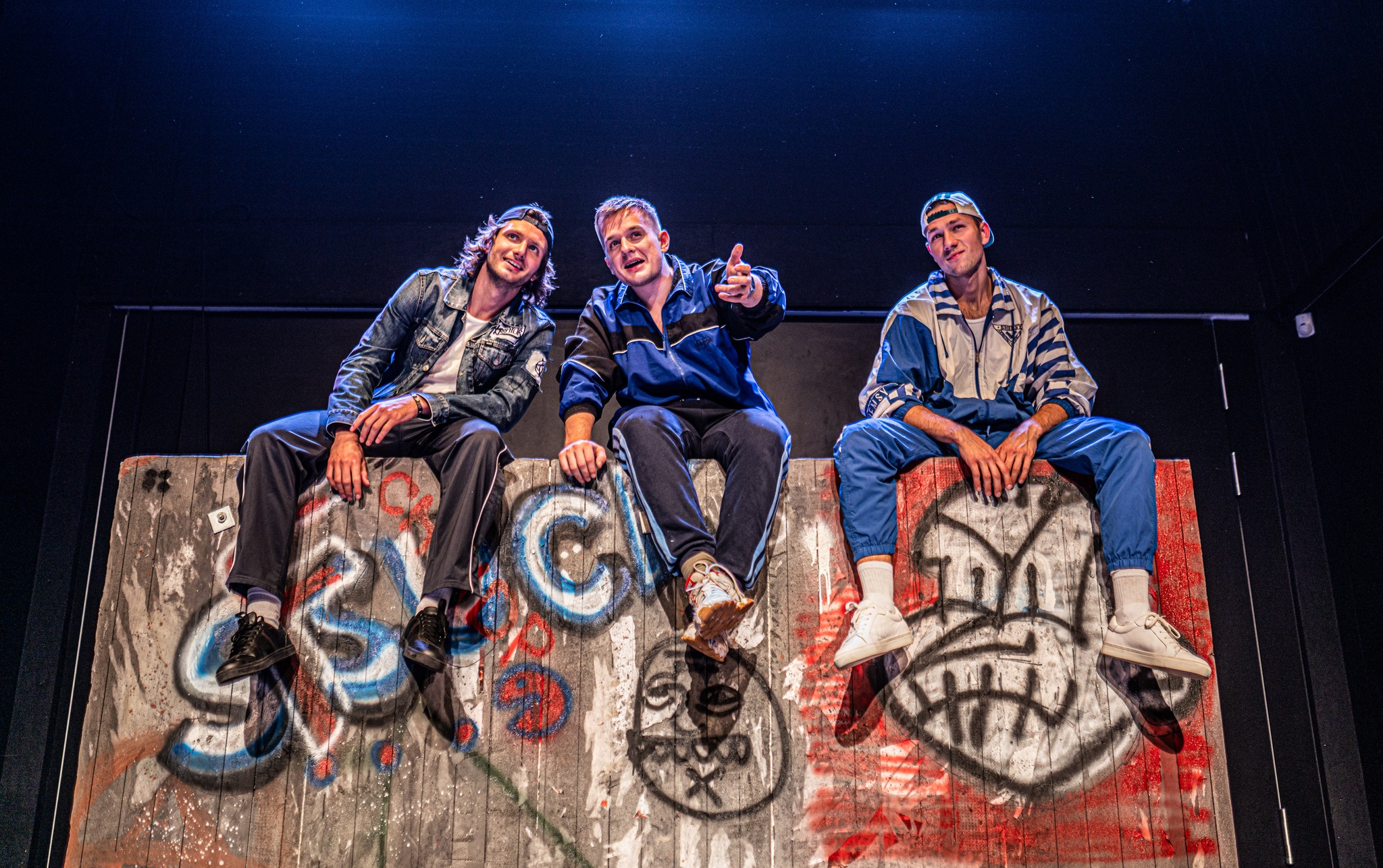 Reżyser dzieli bohatera na trzech aktorów (Adam Rosa, Maciej Czerklański, Michał Iwaszkiewicz), którzy swoim temperamentem i dynamiką tworzonych ról wciągają nas w swój blokerski świat. Czujemy, że uczestniczymy razem z nimi w ich biegu życia, od samego patrzenia prawie dostajemy zadyszki. Aktorzy dają swoim postaciom wiarygodność i bardzo konkretne, emocjonalne wymiary. Niczym T 1000 z Terminatora* zmieniają kształt i tożsamość z prawdziwą lekkością i swadą. Energia przedstawienia jest bardzo wysoka, tempo rewelacyjne. Dynamice spektaklu sprzyja trafiająca w sedno scenografia (Katarzyna Adamczak), czyli zwykły, pomazany graffiti, niewysoki murek. Blokerski klimat na całym świecie jest taki sam, murek, mutatis mutandis, jest tu pępkiem świata. Trzeba także podkreślić bardzo ciekawą muzykę graną na żywo przez Michała Lamżę / Wojciecha Gumińskiego.