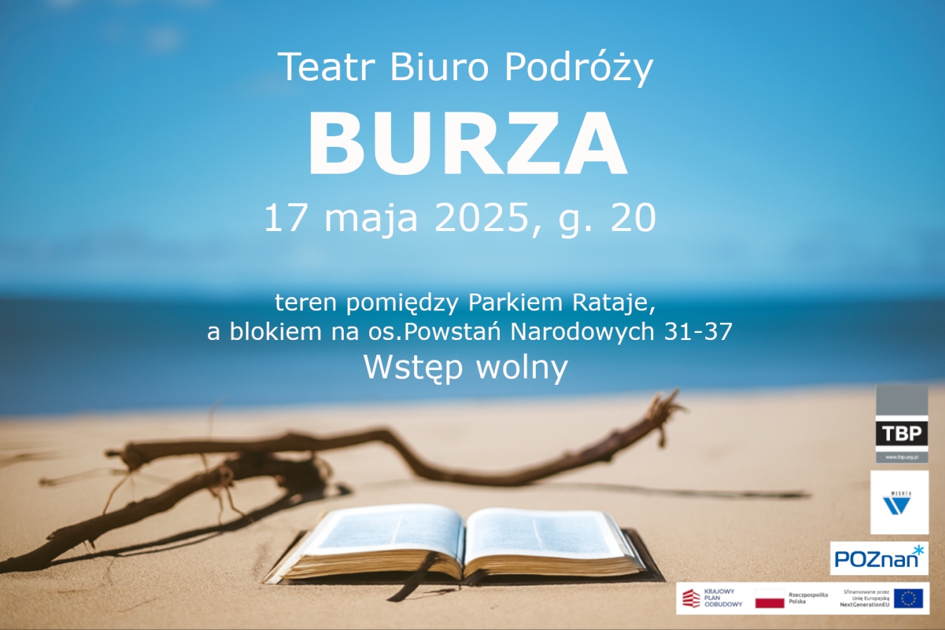 Teatr Biuro Podróży ponownie sięga po Szekspira. „Burza” – najnowsza premiera TBP zostanie po raz pierwszy zaprezentowana w Poznaniu. Plenerowy pokaz odbędzie się w sobotę 17 maja 2025 o godz. 20:00 na terenie pomiędzy Parkiem Rataje a blokiem na os. Powstań Narodowych nr 31-37 w Poznaniu. Spektakl jest kierowany do osób dorosłych i młodzieży. Wstęp na wydarzenie jest bezpłatny.