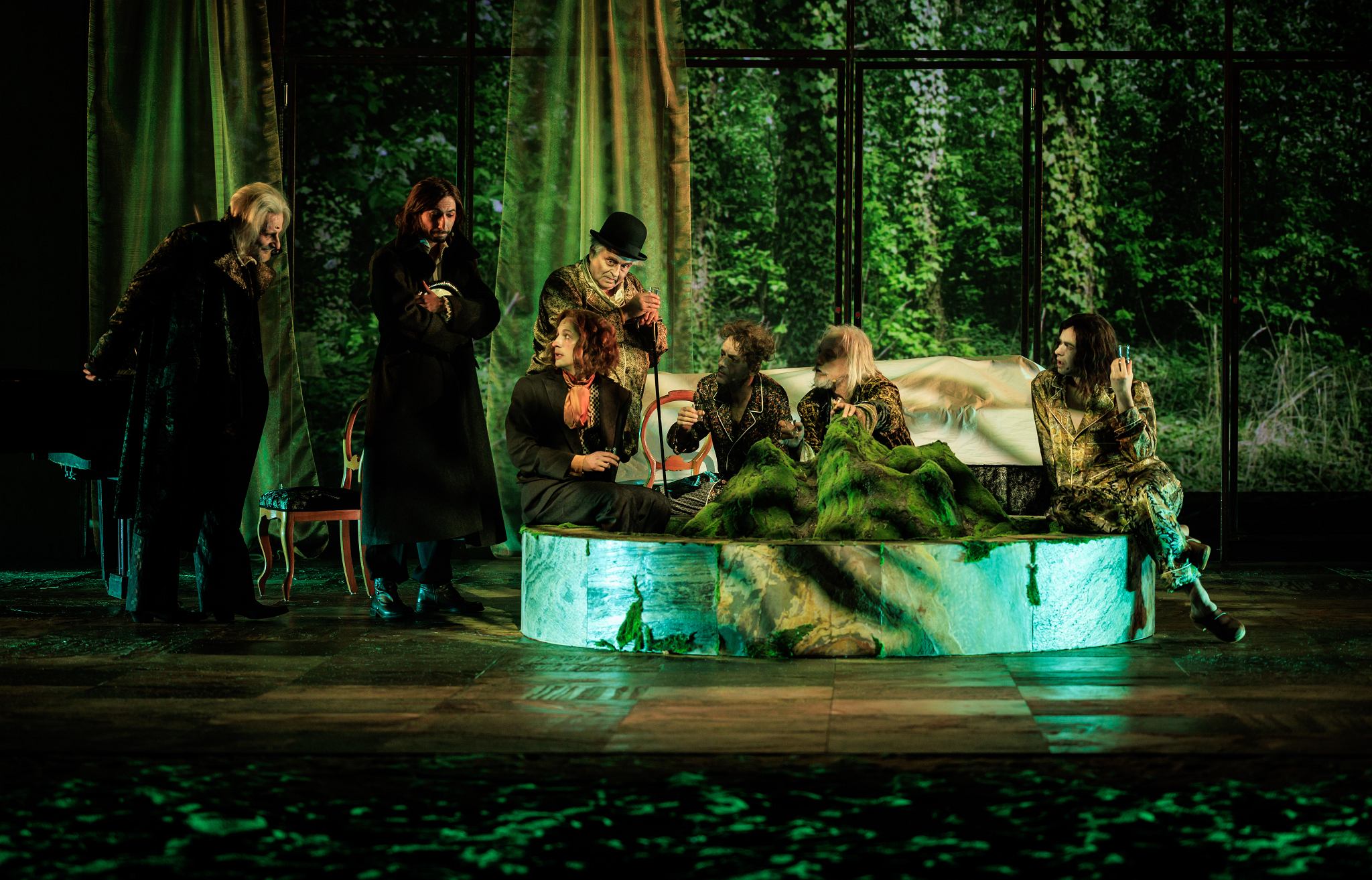 Rozwiązanie scenograficzne, które zaproponowała Katarzyna Borkowska pozwoliło aktorom rozgrywać akcję na stosunkowo niewielkiej scenie, w której centrum niczym w miejskiej fontannie pyszniła się przecudnej urody miniatura spowitych w leśnym oparach omszałych pagórków. Między zamykającą scenę szybą a gigantycznym ekranem z projekcją stworzono drugi plan, na którym zdarzało się przemykać postaciom i dzięki któremu powstawała przestrzenna perspektywa spacerów po lesie. Wreszcie z tyłu przez większość czasu mieliśmy możliwość podziwiać stary liściasty las, który w miarę potrzeb ustępował obrazowi omawianemu przez studenta historii sztuki lub – kilkakrotnie – powracającemu wspomnieniu ojca przemawiającego do głównego bohatera. Wraz z nietypowym światłem, którego znakiem szczególnym były reflektory poziomo świecące w poprzek sceny, elementy te tworzyły niezwykłą przestrzeń. To właśnie dzięki niej klimat przedstawienia faktycznie nawiązywał do tego, który mógł panować w izolowanym od świata, otoczonym borem uzdrowisku sto dziesięć lat temu. Scenografię tedy należy uznać za mocną stronę produkcji.