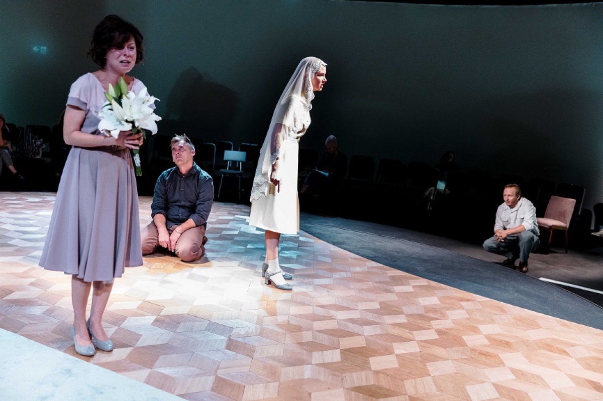 Oszczędna scenografia, z niemal sterylną, drewnianą podłogą; pusta przestrzeń, w której ustawione są jedynie krzesła (nieustannie przestawiane przez aktorów), pozwalają jeszcze mocniej wybrzmieć słowom. Projekcje w tle pomagają jedynie w budowaniu nastroju i w zasadzie mogłoby ich nie być. Dużo większe znaczenie ma krótki, sugestywny teatr cieni w końcowej części dramatu i ostra muzyka Jana Młynarskiego, doskonale współgrająca z emocjami i postępowaniem bohaterów.