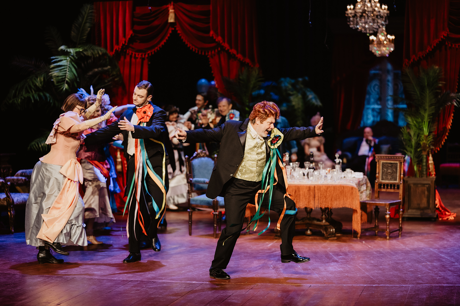 Zagrane i odtańczone jest to wszystko pysznie – niełatwo odpowiednio zaaranżować przestrzeń, która musi pozostać czytelną i pomieścić dwudziestu dwóch aktorów. Choreografia i ruch sceniczny pozostają bez zarzutu, ponieważ profesjonalista, jakim jest Emil Wesołowski zadbał o to, by cieszyły wszystkie zmysły. Całość pozostaje niezwykle zwarta i dynamiczna, nie ma w spektaklu niepotrzebnych miejsc, momentów nadmiernie statycznych czy nużących. Ani cienia nudnej staroświeckości w tym doskonałym materiale autorstwa Bałuckiego! Wytrawni aktorzy swobodnie wchodzą w swe role, ukazując na scenie wszystkie zalety świetnie napisanego tekstu z intrygującymi wizerunkami postaci. Tu ważne są emocje i niepohamowane ambicje bohaterów. Tomasz Błasiak jako Władysław Żelski świetnie czuje się w komediowej atmosferze, osadzonej w kostiumie z epoki. Anna Cieślak, czyli Janina Żelska, gra z lekkością i wdziękiem, oddając wszystkie cienie oraz blaski kreowanej postaci. Hanna Skarga (Kamila) uwodzi niewymuszoną naturalnością i koniecznym cynizmem, a nawet groteskowością wpisaną w jej rolę. Ignacy Liss jako Adolf doskonale jej partneruje… w niektórych scenach aż do utraty tchu. Henryk Niebudek w roli wuja Telesfora jest po prostu niemożliwy. Bohaterowi nie brak karykaturalnych rysów, ale aktor wszystko ma pod kontrolą – mimika, spojrzenie, zmienność głosu, gdy grają emocje są tak dopracowane, byśmy go polubili, nie wyczuli cienia fałszu. Adam Biedrzycki (Wicherkowski) i Ewa Makomaska (Pulcheria) to kolejny wart uwagi, brawurowy duet. Oboje czasem szaleją, zawsze wiedząc, gdzie leżą granice groteski i ironii. Fikalski Szymona Kuśmidra, typ bufonowaty i na swój sposób sympatyczny, zwraca uwagę odpowiednim cieniowaniem, kontrolowaną energią, która czasem wręcz ucieka zza kamizelki. W małżeństwo Ciuciumkiewiczów wcielają się Antoni Ostrouch i Katarzyna Skarżanka. Skarżanka doskonale podkreśla charakter i przewrotność swej bohaterki, cisnąc pod pantoflem męża fajtłapę. Dorota Landowska (Tecia), Eliza Borowska (Miecia), Marta Alaborska (Munia) i Katarzyna Strączek (Lola) jako ich córki, raczej szpetne panny na wydaniu, bawią i przerażają (celowo!). Sprowadzeni przez Fikalskiego tancerze, podejrzane egzemplarze, które zdecydowanie wolą bufet niż panny (przy Ciuciumkiewiczównach to chyba niedziwne) dopełniają obrazu całości – aktorzy w tych rolach z wyraźnym upodobaniem ukazują przywary i śmiesznostki kawalerów. Sławomir Grzymkowski jako Fujarkiewicz, choć kreuje groteskową postać, unika taniego efekciarstwa i banału. Modest Ruciński – Wróbelkowski – zgrabnie balansuje na granicy przerysowania i nadmiernej śmieszności. Tak samo jak Jakub Kordas „ten Malinowski”. Na koniec uroczy Paweł Krucz w roli lokaja Franciszka. Choć to drugoplanowa rola, ale zagrana tak udatnie, że czasem wydaje się pierwszą.