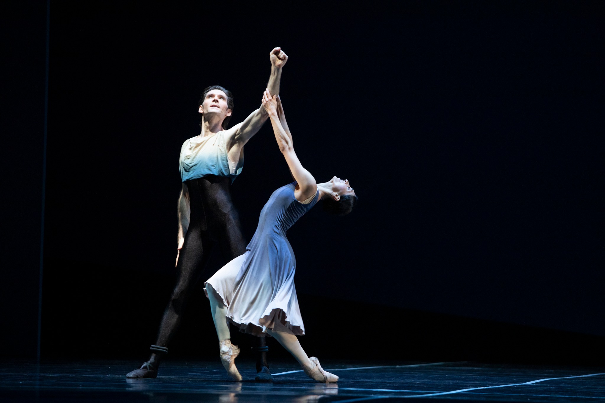 Tryptyk baletowy otwiera choreografia klasyka szkoły holenderskiej Hansa van Manena, przygotowana do niesamowitej „Grosse Fuge” oraz „Cavatiny” z Kwartetu smyczkowego B-dur. Wielka fuga jest dziełem o szorstkiej i wyrafinowanej polifonii, nowatorskim w czasach Beethovena, z elementem intrygującej „brzydoty” i tajemniczej aury. Wszystko to podkreśla wyczulony na muzyczne niuanse dyrygent Alexei Baklan i Orkiestra Teatru Wielkiego – Opery Narodowej, która dzięki koncentracji oraz uważności wydobywa całe piękno i pełną paletę różnych barw gigantycznego dzieła. I właśnie surowość oraz prostota charakteryzuje układ dla ośmiorga tancerzy – czterech mężczyzn i czterech kobiet splatających się w subtelnie zaznaczonych zależnościach – uległości, poddaniu, miłości, dominacji i rywalizacji. Kostiumy podkreślają wszelkie niedookreślenia płci czy ukrytych pragnień. Ale to jedynie szkic, zarys – choreograf podkreśla raczej czytelność oraz wymowność ruchów i trudno tu mówić o akcji dramaturgicznej. W zasadzie Hans van Manen skupia się na czymś innym. W balecie patrzy na czystość plastyki tańca, bez ukrytych podtekstów, a sama narracja sprawia wrażenie niemożliwej do spełnienia idei. Na plan pierwszy wysuwa się idea cielesności, zachwyca dopracowana synchronizacja ruchów tancerzy i ich umiejętność przekazywania złożonych emocji, jednak z ogromną i wyraźną powściągliwością (celową?). Siła tkwi w wydobywaniu przekorności, która rozpływa się w ogólnej harmonii dzieła. Zrównoważony taniec, z równo rozłożonymi głosami, czyste w rysunku pozy prezentowane w jasnej przestrzeni scenicznej (scenografia Jean-Paul Vroom) złamanej czernią i chłodnym światłem, jawią się niezwykle plastyczne. Solidna konstrukcja emanuje niepokojącą, tajemniczą zmysłowością i nieuchwytną aurą, choć opiera się na prostych elementach. Warto wspomnieć, że wszyscy trzej holenderscy choreografowie są mocno zakorzenieni w balecie współczesnym, jednak garściami czerpią z techniki klasycznej. Ale w „Grosse Fuge” Hans van Manen rezygnuje z tańca na pointach, a jednocześnie wysoko stawia tancerzom poprzeczkę. Wśród solistów zdecydowanie wyróżnia się Kristof Szabo – młody artysta z piękną sylwetką, który w swym tańcu (nie tylko tym razem) łączy zarówno siłę, jak i delikatność, perfekcję i miękkość ruchu. Oko przyciąga też Marko Juusela, którego widzę po raz pierwszy i mam nadzieję nie ostatni.
