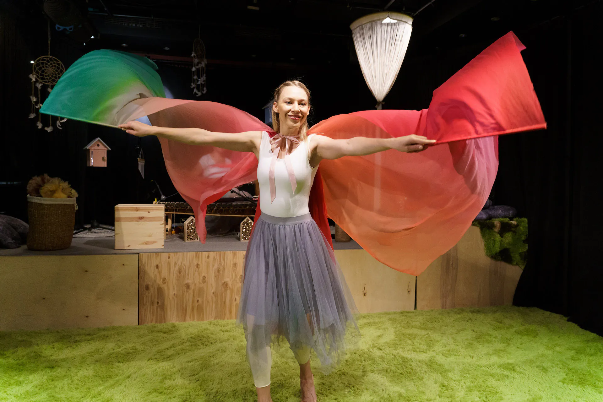 Podczas „Łąki” trudno usiedzieć w miejscu. Najbardziej zatwardziali rodzice, koniec końców, sami łapią za nitki babiego lata, rozwieszając je nad sceną. Z twarzy dzieci nie znika uśmiech i ciekawość, co jeszcze zobaczą podczas tej krótkiej podróży za róg lasu i polnej dróżki. Opowieść o życiu zwierząt i roślin łączy walory edukacyjne z tymi czysto rozrywkowymi. Twórcy priorytetowo stawiają na swobodę. Podkreślają to, rezygnując z tradycyjnego podziału na scenę i widownię. Dagmara Bąk z gracją i subtelnością, niczym kameleon zamienia się na oczach dzieci w kolejne zwierzęta. Zwinnie omijając biegających najnajów, prowadzi ich przez sceniczną narrację namawiając do działania i próbowania nowych rzeczy. Integracja z przestrzenią i innymi uczestnikami wznosi „Łąkę” na poziom czegoś na kształt performansu i instalacji artystycznej, w których twórcy z czułością przyglądają się reakcjom małych odbiorców. A te potrafią zaskoczyć nawet rodziców!