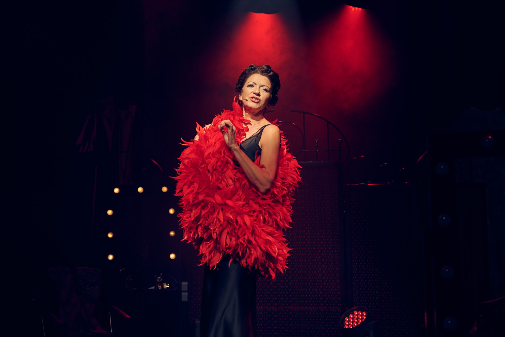 Po drugie, spektakl korzysta z wielu zabiegów komediowo-kabaretowych. Np. operowanie licznymi rekwizytami tylko dla osiągnięcia efektu komicznego jest często stosowane, dla równowagi cały szereg rekwizytów ma swoje uzasadnienie dramaturgiczne w dłuższej perspektywie i stanowi narzędzie znacznie bardziej skomplikowanego przekazu. Kabaretowość wyraża się również w interakcjach z publicznością, łamaniu „czwartej ściany” (choć to określenie w Teatrze STU jest raczej niewłaściwe, tutaj łamana jest również druga i trzecia ściana) bez wychodzenia z roli. Nie jestem pewien, czy w innych okazjach takie przełamania wypadłyby wiarygodnie, zwłaszcza kiedy traktujemy widownię jako rzeczywistą widownię, ale gdy bohaterki są aktorkami i aktorki bohaterkami, cała granica zaciera się na tyle, że jej poszukiwanie nie należy do priorytetów.