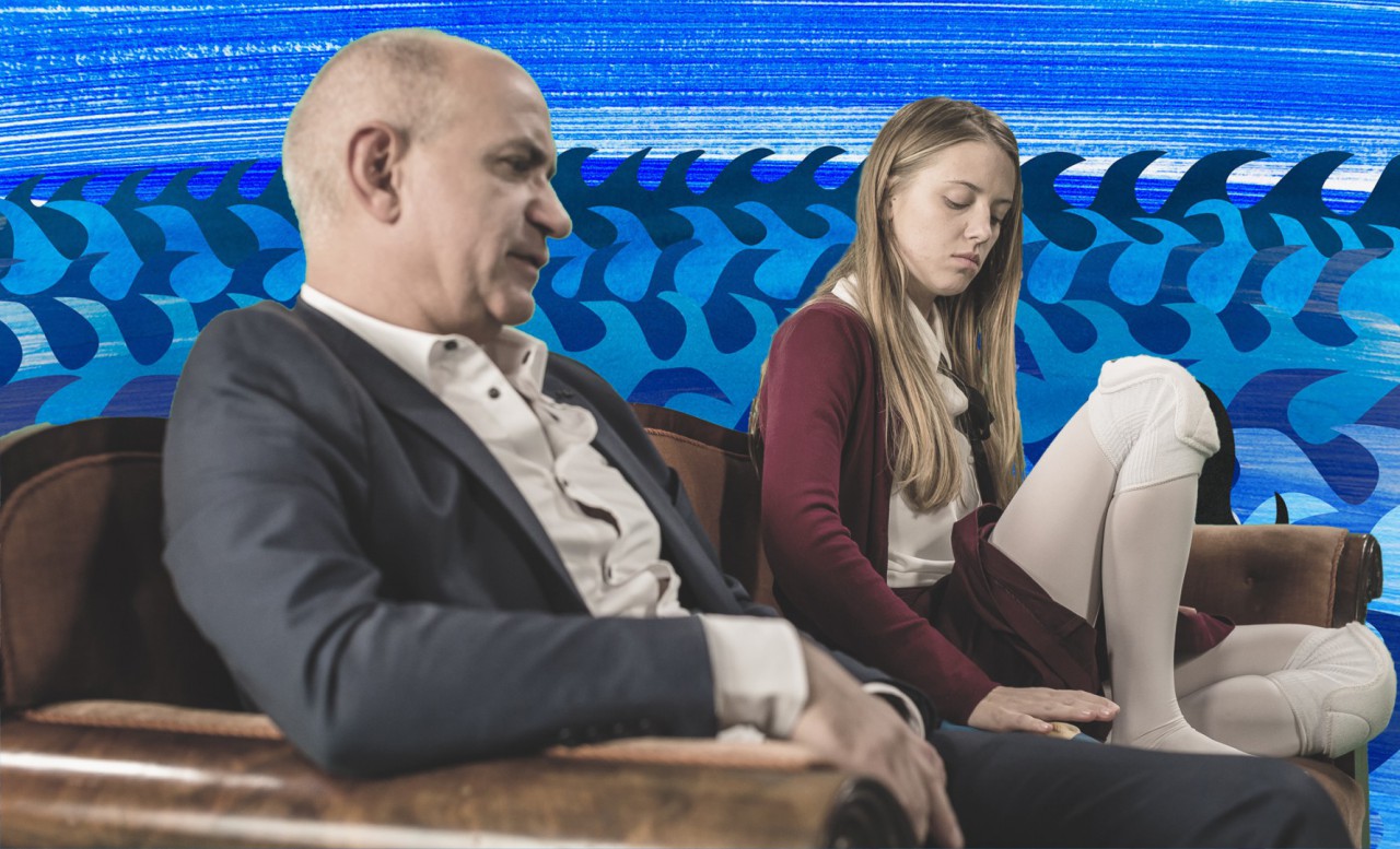 Okazuje się (na podstawie retrospekcji, które w narracji „Zgagi” odgrywają zasadniczą rolę), że ten egoistyczny, cyniczny jegomość z rozbuchanym ego i lekceważącym stosunkiem do swoich kobiet, sam jest w istocie rzeczy zakompleksionym, niedowartościowanym człowiekiem, gnębionym w przeszłości przez rodziców, a zwłaszcza ojca, któremu nigdy nie udało mu się dorównać, o czym niezmiennie przypomina mu matka (Jolanta Olszewska). Tadeusza gra Krzysztof Dracz, bardzo przekonująco pokazując człowieka o dwóch twarzach, budującego swój pozorny autorytet przez pomiatanie innymi, a jednocześnie świadomego swoich wewnętrznych traum. Partneruje mu Ewa Skibińska, znakomita jako kobieta stłamszona przez męża, przypadłość córki i macierzyństwo nie do końca będące – jak się wydaje – chciane. Zuzannę zagrała Maria Kania, wtedy, w 2015 roku, aktorka świeżo po studiach w krakowskiej PWST (dziś znana m.in. z roli Mariki w „Skazanej”). Kania bardzo dobrze opanowała fizyczność zwierzęcia, w które wciela się jej bohaterka i jest przez to niezwykle poruszająca jako dziecko, próbujące za wszelką cenę zwrócić na siebie i swoje problemy uwagę zajętych sobą i wzajemną walką rodziców.