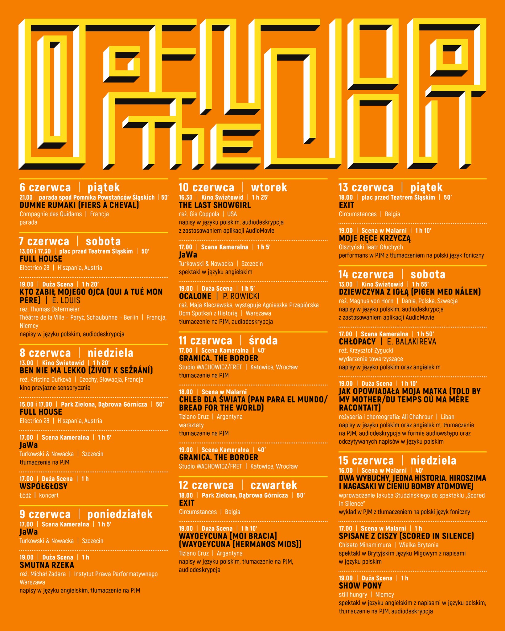 - 19:00 – Show Pony – autobiograficzny projekt berlińskiej grupy cyrkowej still hungry, ukazujący życie artystek współczesnej sztuki cyrkowej.
