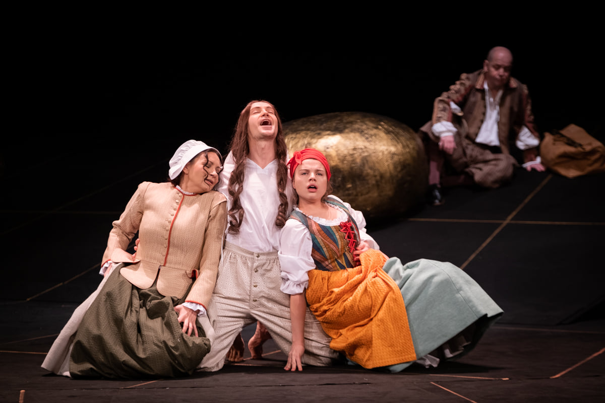 Aktorzy znakomicie wyczuwają rytm i klimat klasycznego dramatu, zwracając uwagę na groteskowość oraz komizm postaci z mrocznymi elementami w duszy. Dialogi płyną wartko, każda fraza, każde słowo wypowiadane jest z należytą dykcją. Z dbałością o szczegóły tworzą swoje kreacje – pełne werwy, barwne i intrygujące. Krzysztof Kwiatkowski, wcielając się w postać Don Juana, ukazuje wszelkie niuanse i prawdziwość charakteru tego niejednoznacznego bohatera. Mimo cynizmu i egocentryzmu, prowokacyjnych zachowań, balansowania na granicy życia i śmierci, Don Juan nie jest człowiekiem z gruntu złym. Zepsuty do granic niemożliwości, ale odważny. Nie przeczę – jest bezwzględny i nie przejmuje się uczuciami innych ludzi. Jednak nie można zarzucać mu fałszu – w każdym momencie pozostaje niesamowicie konsekwentny, nigdy nie udaje kogoś innego. To prawda, uwodzi perfekcyjnie, ale nigdy nie stosuje przemocy. Sprawia wrażenie człowieka poszukującego, choć – niestety – z góry skazanego na gorzką i nieunikniona klęskę. Kwiatkowski cały czas pokazuje młodzieńca szukającego wyzwań, wnikliwego obserwatora otaczającej rzeczywistości, oceniającego świat z wielką bezpośredniością i szczerością. Młody aktor świetnie radzi sobie z rolą, broni swego bohatera z naturalnością i swobodą, przydając mu wdzięku i błyskotliwej inteligencji. Jego postać intryguje, nie poddając się łatwej ocenie. Jego monolog o hipokryzji to jeden z lepszych fragmentów spektaklu! Obok niego wierny sługa Sganarel – Adam Biedrzycki znakomicie partneruje młodszemu koledze, kreśląc sylwetkę prostolinijnego, „ludowego filozofa”, który zbyt często ulega tchórzostwu. Czasem wręcz przyćmiewa głównego bohatera – sposobem mówienia w monologu, innym razem celną ripostą i dialogiem. Umiejętnie stosuje środki aktorskiego wyrazu; słowem, gestem, mimiką wydobywa zarówno humorystyczne elementy molierowskiego tekstu, jak i te znacznie poważniejsze. Wie kiedy zwolnić, kiedy przyspieszyć, nie popadając przy tym w przesadę. Cieniując, z wyczuciem oddaje wady swego bohatera. Inne kreacje nie są już tak wyraziste, choć na uwagę zasługuje Paweł Krucz w roli trochę rubasznego, ale wielce sympatycznego Pietrka i jego ukochana – urokliwa, acz łasa na komplementy i naiwnie łatwowierna Karolka – Bernadetta Statkiewicz. Są jeszcze bracia uwiedzionej, zhańbionej Dony Elwiry (gra ją Dorota Bzdyla), których całkiem dobrze grają Krystian Modzelewski i Tomasz Błasiak. W maleńkiej roli, ale z wyczuciem Dominik Łoś kreuje postać drugoplanowego bohatera – zabawnego, mocno groteskowego Pana Niedzieli. Nie przekonuje mnie Antoni Ostrouch jako Don Luis, choć sztywność postaci wynikać może ze scenariusza. Blado wypada Komandor, ale z jego postacią – kamiennym posągiem – reżyserzy często mają problem. W rezultacie niosące grozę – z założenia – starcie zaświatów z młodym libertynem nie wywiera koniecznego wrażenia.