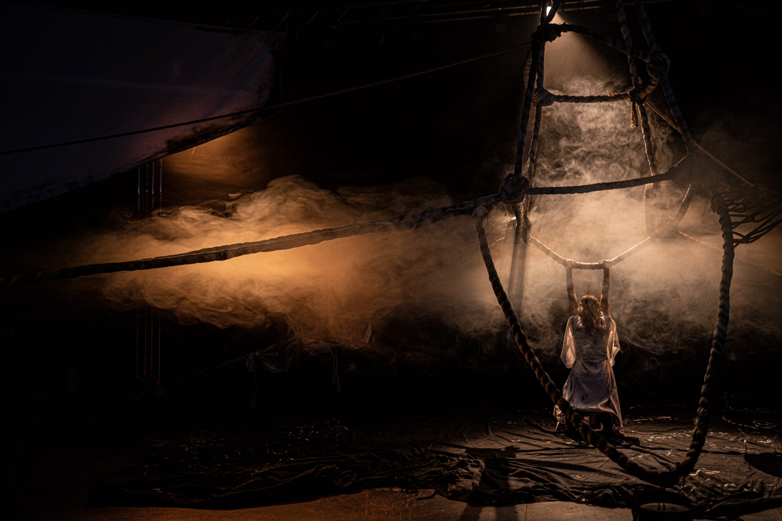 Na scenie widzimy liny powiązane w kształt jurty. Na podłodze pofałdowana tkanina wyglądająca jak błoto. Dwójka performerów zaczyna reportażową opowieść.