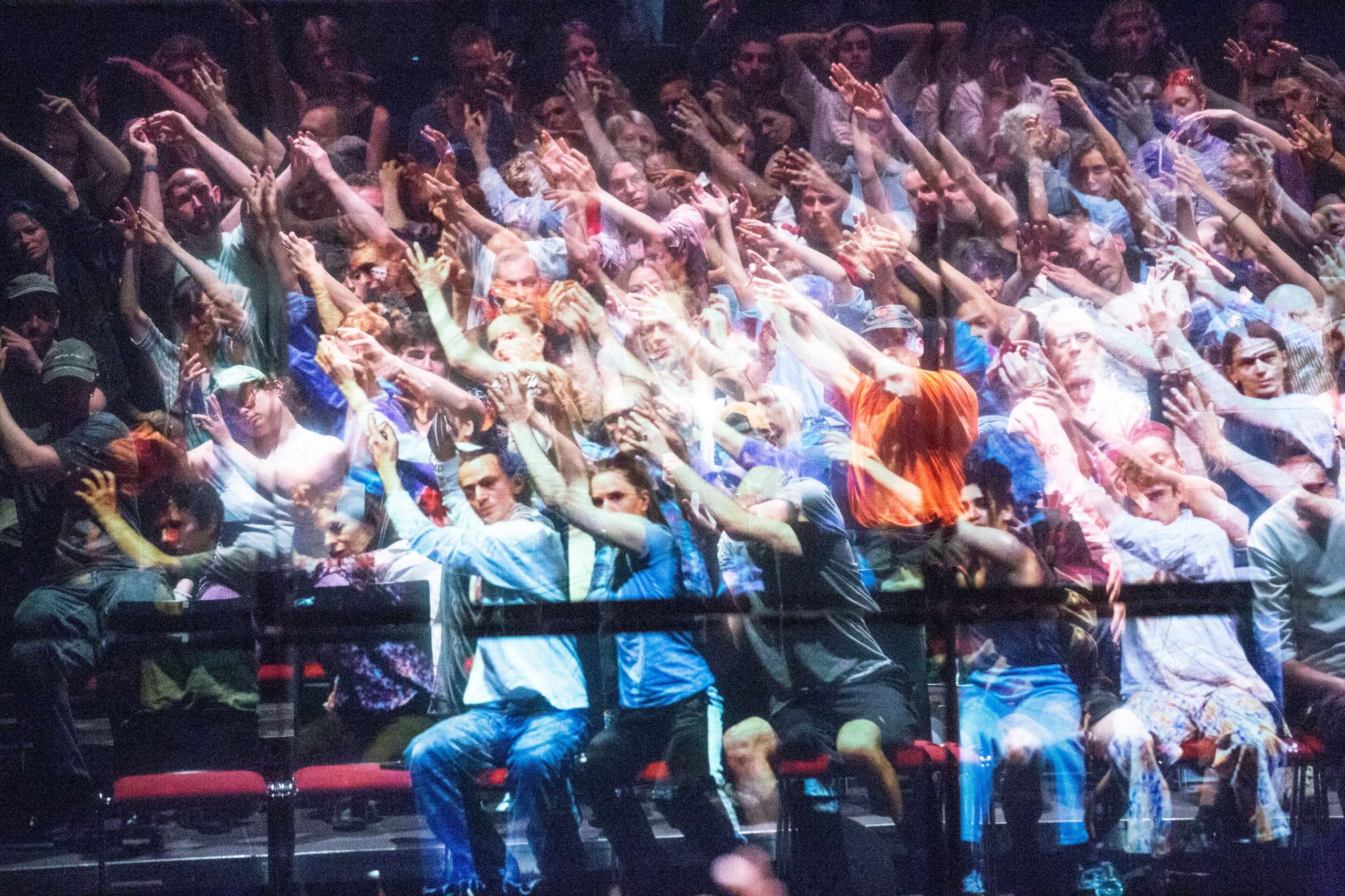 Odbijamy się w wielkim lustrze – ekranie, poza tym przestrzeń sceny jest pusta. Lustrzane odbicie i wpatrywanie się w nie… Trwające, dłużące się monotonią minuty. Ma to być i w pewnym momencie już staje się doświadczeniem trudnym, może nawet uciążliwym, bo widownia, po początkowych szeptach, gestykulacji, milknie. Ta cisza pokazuje istotę performansu – wyprowadzić ludzi z ich świata, życia, doświadczenia i zafundować coś innego. Coś, co jak w rytuale będzie miało swoją fazę przejścia, przekroczenia. Nie wiemy kto intonuje gesty, potem choreograficzne układy, głos z off’u prowokacyjnie mówi Myślę, że nie wszyscy się przyłączą… Zdecydowana większość wcześniej czy później to robi. Głos znowu informuje, że to neurobiologicznie uzasadnione, ale też, że Ci którzy się nie przyłączają (jakieś 10% widowni), to indywidualiści często kwestionujący zasady.