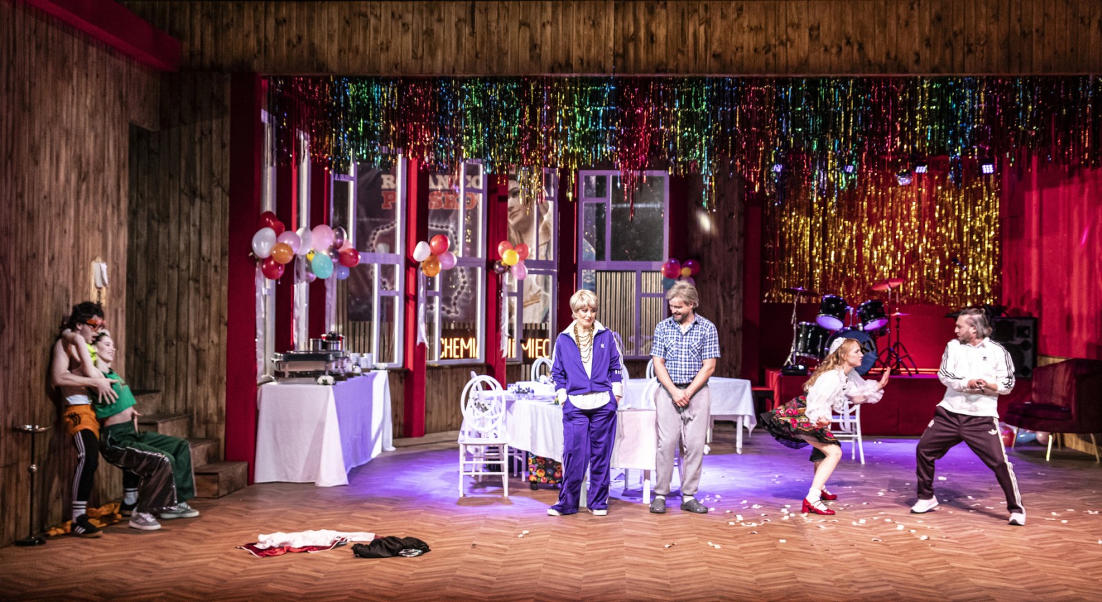 W sumie taka sobie sztampowa historyjka, jakich wiele powstało w czasach, gdy tworzył Bohomolec. Ale jakże, okazuje się, aktualna do dzisiaj. Dobrze, że Jarosław Tumidajski wziął ją (nie pierwszy raz, zresztą) na warsztat. Wszak i teraz, 258 lat później, mamy starszych panów, którzy urządzają życie uczuciowe młodych kobiet; nie brakuje też szowinistów odmawiającym cudzoziemcom prawa do funkcjonowania w kraju nad Wisłą na prawach równych możliwościom rdzennych tubylców, powołując się przy tym na religię. Ciasnoty, by nie powiedzieć tępoty umysłowej, też nie udało się wyeliminować z przestrzeni stosunków międzyludzkich. Reżyser nie musiał się więc szczególnie starać, by sztukę oświeceniową uwspółcześnić. Owszem, dokonał kilku skrótów – niektórych w imię poprawności politycznej, innych w imię dążenia do właściwego zrozumienia dawnej polszczyzny przez dzisiejszego użytkownika języka polskiego. Dodał też od siebie kilka autentycznie zabawnych pomysłów, jak choćby przekupywanie przez Ernesta potencjalnego teścia niemiecką chemią lub plastikowymi talonami z imponującymi kwotami wręczanymi w błysku aparatu fotograficznego, podryw na śmiech żelki czy zapijanie bezradności przez Elizę. Świetnie to współgra ze wspomnianymi już strojami i wystrojem salonu Bywalskiej, który scenograf Michał Dracz przysposobił na salę weselną rodem z lat 80. minionego stulecia. A do tego dodać należy misz masz muzyczny, który stworzył Tumidajski, zwyczajowo sam opracowujący muzycznie swoje spektakle. W ścieżce dźwiękowej „Małżeństwa z kalendarza” w Teatrze Powszechnym w Radomiu mamy więc „Rotę”, marsz żałoby Chopina, zespoły Alphaville i Eurythmics i … Cleo. Aktorzy znakomicie odnajdują się w konwencji zaproponowanej przez reżysera. Tworzą wyraziste postaci, czasem lekko przerysowane jak stworzył je sam Bohomolec. Bryluje wyraźnie Katarzyna Dorosińska jako Agata, ale i pozostali mają swoje warte docenienia „pięć minut”. Osobiście z przyjemnością oglądałem Zuzannę Repelowicz, Filipa Łannika i Tomasza Wóltańskiego, którzy do radomskiego zespołu dołączyli zaledwie w ubiegłym roku, a już pokazali niebagatelny talent – tu komediowy.