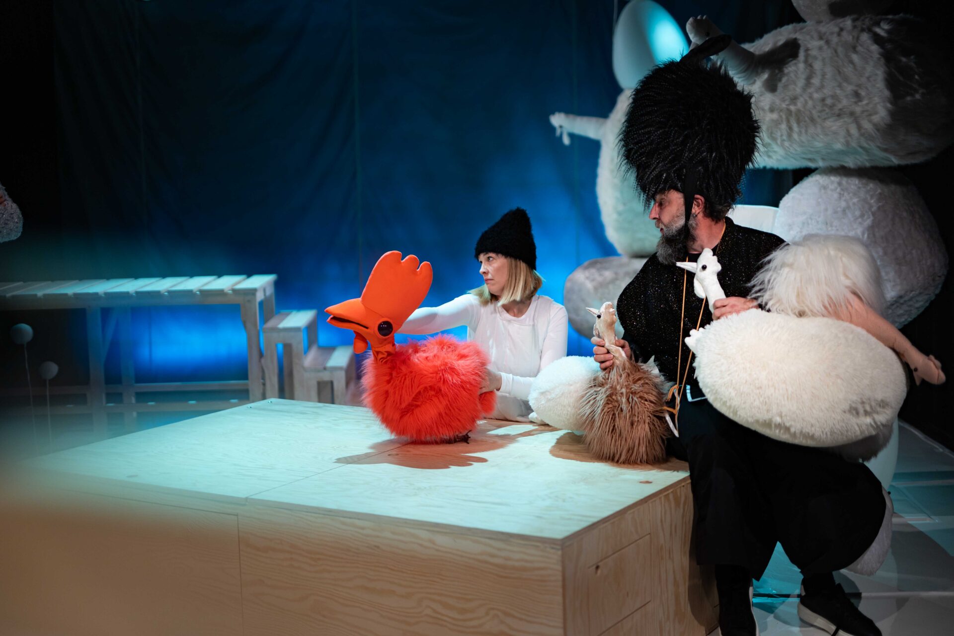 Rozigrana, śmieszna opowieść z poważniejszymi motywami utrzymana jest w konwencji zabawy, w której linia dramaturgiczna płynie, gna i spaja się z wciągającą opowieścią. W radosno-melancholijną rzeczywistość tworzoną przez reżysera i autorkę tekstu wkraczają aktorzy. Dzięki nim kameralną scenę zapełniają barwne, fantazyjne postacie – koniecznie zwierzęce. W Borsuka wciela się Bartosz Mazur – czyni to gładko, farsowo, choć momentami na poważnie. Czasem zaskakuje nieodkrywanymi wcześniej myślami, zachowaniami,  skłaniając starszych do refleksji nad możliwością przemiany, a dzieci intrygując nieoczywistym wizerunkiem. Wyborny jako Borsuk, jeszcze lepszy jako partner i przyjaciel Skunksa, pomaga zrozumieć ludzkie emocje, przywiązanie do drobnych rytuałów. Wiktor Korzeniewski, po raz pierwszy w spektaklu dla dzieci, od razu budzi wielką sympatię, choć niezły z niego szaławiła. Gra z werwą godną pozazdroszczenia, kreując postać radosnego i otwartego na świat, ciekawego i życzliwego, ale niemożliwie nieznośnego Skunksika. Obaj panowie mają szansę wzruszyć każde serducho, pokazując jak zderzenie dwóch różnych osobowości zmusza bohaterów do oczywistych i nieoczywistych kompromisów, bo tylko dzięki temu możliwa jest wzajemna akceptacja i porozumienie. Obok nich pojawia się znakomita w swej zmienności Anna Przygoda. Mam na myśli role, które gra w spektaklu – ciocia Lula, Gronostaj, Jeżozwierz i oczywiście kury, pokazane z niesamowitą magią i energią. Aktorka w zabawny i niecodzienny sposób kontrastuje swoich bohaterów, uwypuklając ich najważniejsze cechy, naśladując głosy. Ponadto animuje lalki – przezabawne kury i ich przywódczynię, Wielką Kurę.