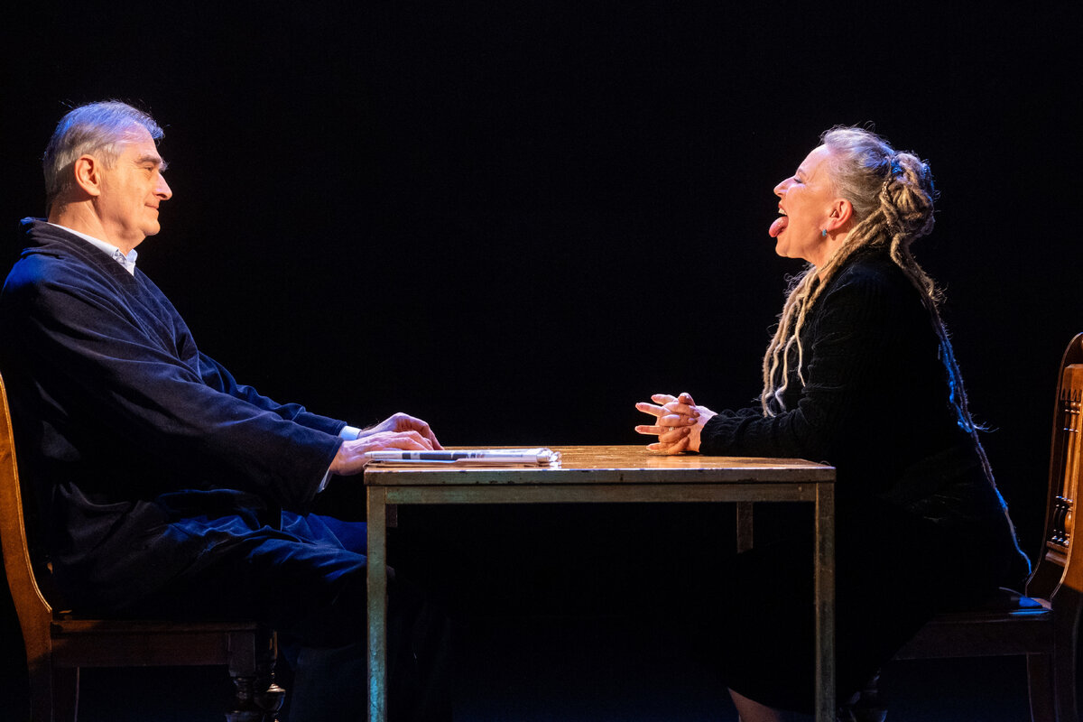 Świetny tekst dramatu poety, eseisty i wybitego tłumacza z języka włoskiego Jarosława Mikołajewskiego jest pełen niuansów i emocji. Opowiada o przemijaniu, roli poety we współczesnym świecie i o potrzebie przygotowania się do ostatniej podróży. Pierwotnie napisany był dla mężczyzny, ale Krystyna Janda odwróciła sytuację dramaturgiczną. W jej historii to ona jest tytułową bohaterką – Poetką, a Mąż (poruszający Olgierd Łukaszewicz) jej troskliwym opiekunem. Dlatego początkowo szokuje ostry tekst w ustach Krystyny Jandy ostro krytykujący rzeczywistość, w której poeci nie mają co do garnka włożyć. Raz po raz ze sceny lecą bluzgi, a sytuacja śmieszna miesza się nieustannie z tragiczną. Jak w życiu. Dopiero potem, gdy narracja zwalnia, a Poetka rozpoczyna swoją podróż w celu załatwienia sobie pogrzebu, za darmo, w Alei Zasłużonych, słabnie jej siła. Janda jest cicha, zgaszona. Walczy resztką sił. Inaczej się porusza. Cały jej wewnętrzny rytm zwalnia, jakby jej życie wołało – stój!