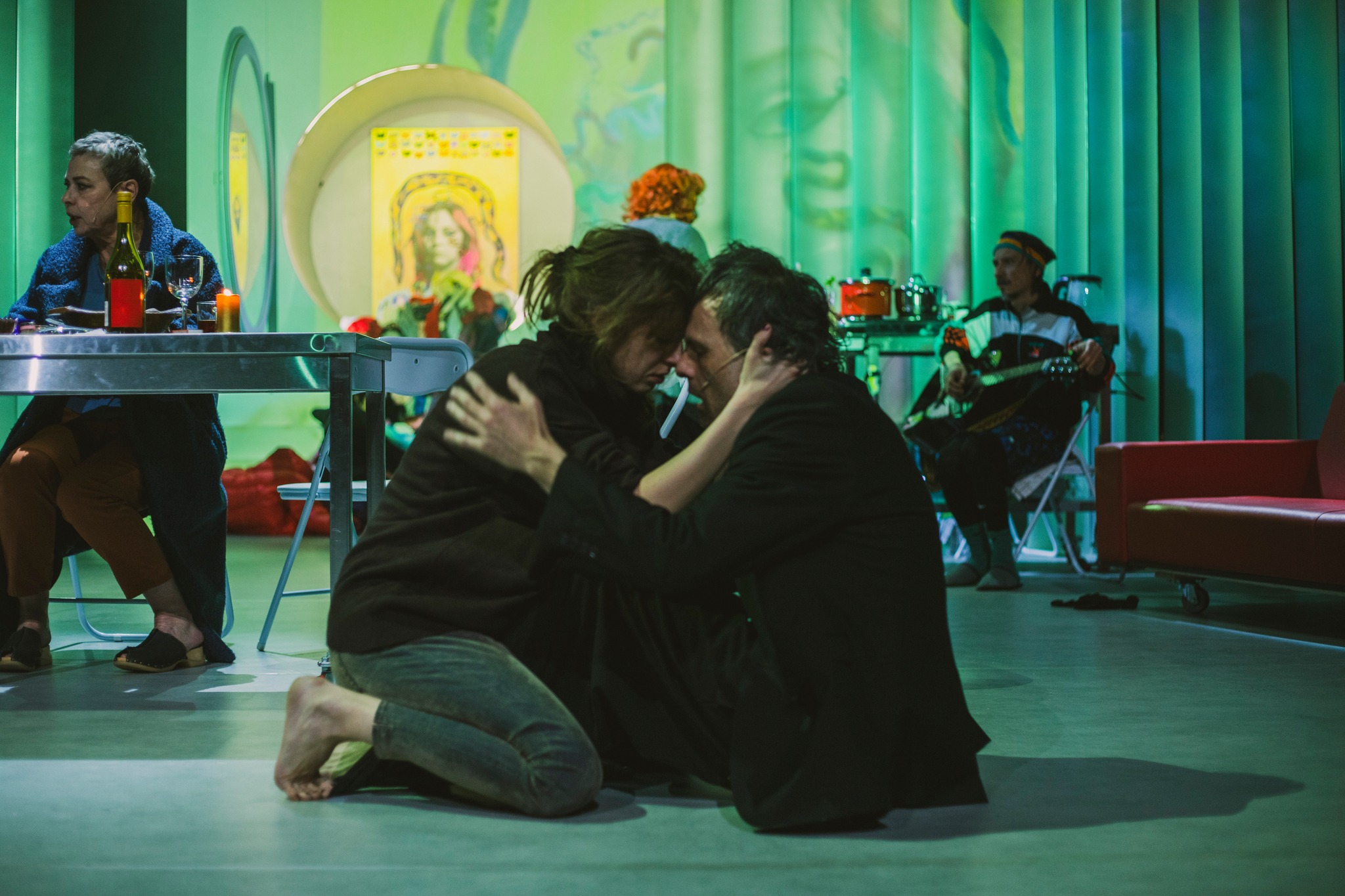 Rodzina nie spotyka się w takim składzie na regularny niedzielny obiad. Obserwując sposób, w jaki się komunikują, trudno byłoby uznać, że podobne obiady mają w zwyczaju. Każdy ewidentnie jest zamknięty w swoim świecie. Te światy rozrywa jednak pewne wydarzenie – śmierć. I to śmierć nastolatki (Antonina Marcyniak). W rodziców, którzy tracą córkę, wciela się aktorski duet: Aleksandra Popławska i Tomasz Tyndyk. Para przechodzi przez swój koszmar, oderwani są od absurdalnych dyskusji. Matka dziewczynki niemal nic nie mówi, nieobecnie patrzy w dal, zgarbiona siedzi przy stole lub zwija się w kłębek na kanapie i przykrywa kurtkami. Ojciec ma białą twarz, umęczone ciało, jakby zaraz miał się rozpaść. Widać, że ta dwójka prowadzi zaawansowane wewnętrzne monologi wokół pytania “dlaczego?”. Nierówną walkę z tym i setką innych pytań symbolizuje wielki bęben pralki w tyle sceny. Rodzice wpadają do niego, biegną w nadziei, że zrozumieją. Upadają, zostają ze swoim bólem. I stertą pustych ubrań. Ciało córki już ich nie wypełni sensami i oddechami.