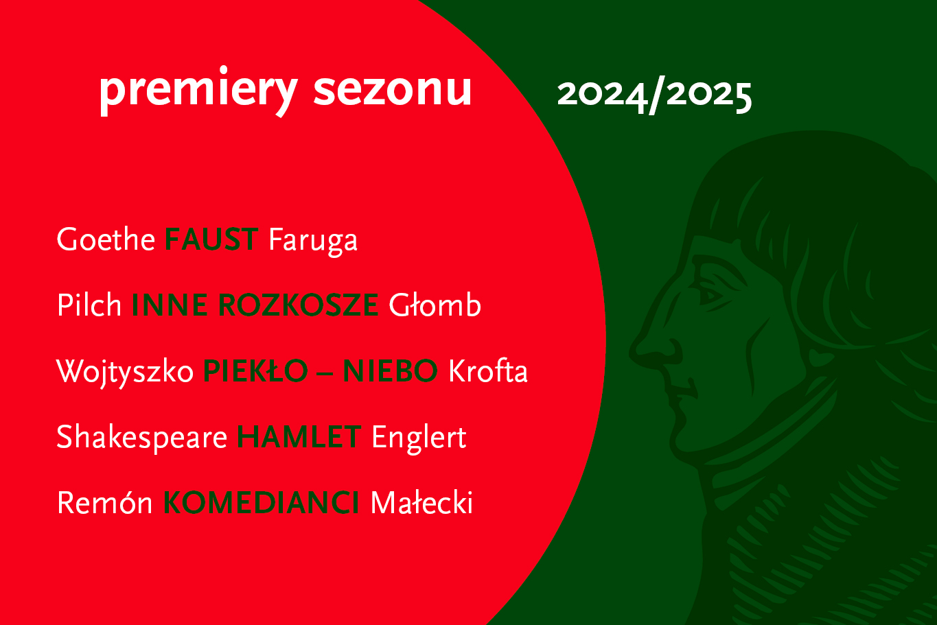 Wielką scenę – Salę Bogusławskiego – zajmą dwa spośród najbardziej ikonicznych dzieł europejskiej tradycji. Już 26 października pierwsza premiera sezonu – „Faust”, arcydramat Johanna Wolfganga Goethego, stanowiący summę doświadczeń jego długiego życia i jego wnikliwych poglądów na europejską cywilizację. Dzisiejsi czterdziestolatkowie, reżyser Wojciech Faruga i dramaturżka Julia Holewińska próbują spojrzeć przez Goetheański pryzmat na nasze czasy i na XX wiek, który je ukształtował. Natomiast w kwietniu 2025 roku na scenę powróci William Shakespeare również swoim arcydramatem: „Hamletem” w autorskim ujęciu reżyserskim Jana Englerta.