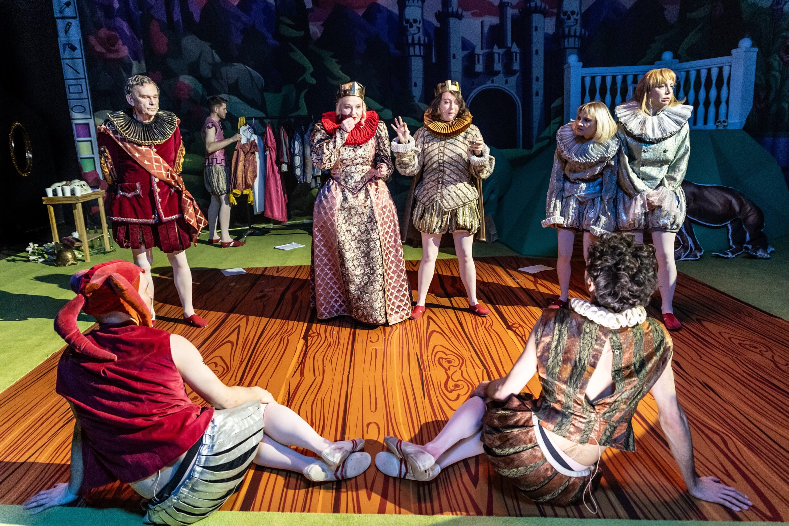 Tak chaotyczna oprawa idealnie wpisuje się w kontekst konwencji ironicznie performatywnej pierwszego aktu, w którym odmitologizowani bohaterowie Hamleta, z oderwanymi koturnami (znanymi nam z innych inscenizacji teatralnych i realizacji filmowych) i także pozbawieni własnych, charakterystycznych cech aktorskich „miotają się” w Szekspirowskiej farsie, kuglują rolami i historyzującymi kostiumami (także wg projektów Natalii Mleczak), do tego wypowiadając swoje kwestie z przejaskrawionym brytyjskim akcentem. Nie jest jednak tak źle! Tragedii przecież nie ma, ale nadciąga wspomniana satyra, w której i przydziałem ról i pogmatwaniem płci Cezary Tomaszewski mruga do widzów okiem. Oto mają przed sobą najstarszego chyba odtwórcę roli Hamleta w dziejach polskiego teatru – Mariana Jaskulskiego (obchodzącego przy okazji premiery jubileusz 50-lecia na scenie) i jego Hamleta dostojnie przerażonego choćby faktem, że nie przystaje polskim akcentem do otaczających go farsowo-karczmianych komediantów. Nie współbrzmi ze swym stryjem, wulgarnym i pantagruelicznym Klaudiuszem, w którego wciela się Emilia Piech, nie uzupełnia również czarująco rozśmieszającego widownię Karola Franka Nowińskiego w roli Ofelii i Ducha używającego kuchennych metafor (kapitalna Małgorzata Wiśniewska), czy nie dialoguje z celującym aktorsko Horacjem (Michał Surówka). Gonią wszyscy co sił w nogach wokół sceny, zmieniają kostiumy, łapią rozrzucane w powietrze kartki scenariusza i… choć wyczyniają swe harce w sposób widowiskowy (w rozegraniu-całowaniu duetu Błaznów – Karol Franek Nowiński i Michał Surówka), to wszyscy bohaterowie dalecy są od typowej ilustracji sztuki scenicznej będącej „zwierciadłem dostojeństwa”. Cezary Tomaszewski, decydując się na teatr formy, pozbawił postaci Szekspirowskiego dramatu ich wewnętrznego Ja, pozwalając jedynie Narratorowi (student Bydgoskiej Akademii Muzycznej, Filip Lasota) na próby utrzymania w ryzach teatralnego chaosu i w kunsztownym wykonaniu pieśni Johna Dowlanda Come again zawołać, by „(…)Wracać! I przestać płakać z powodu nieuprzejmej pogardy”.