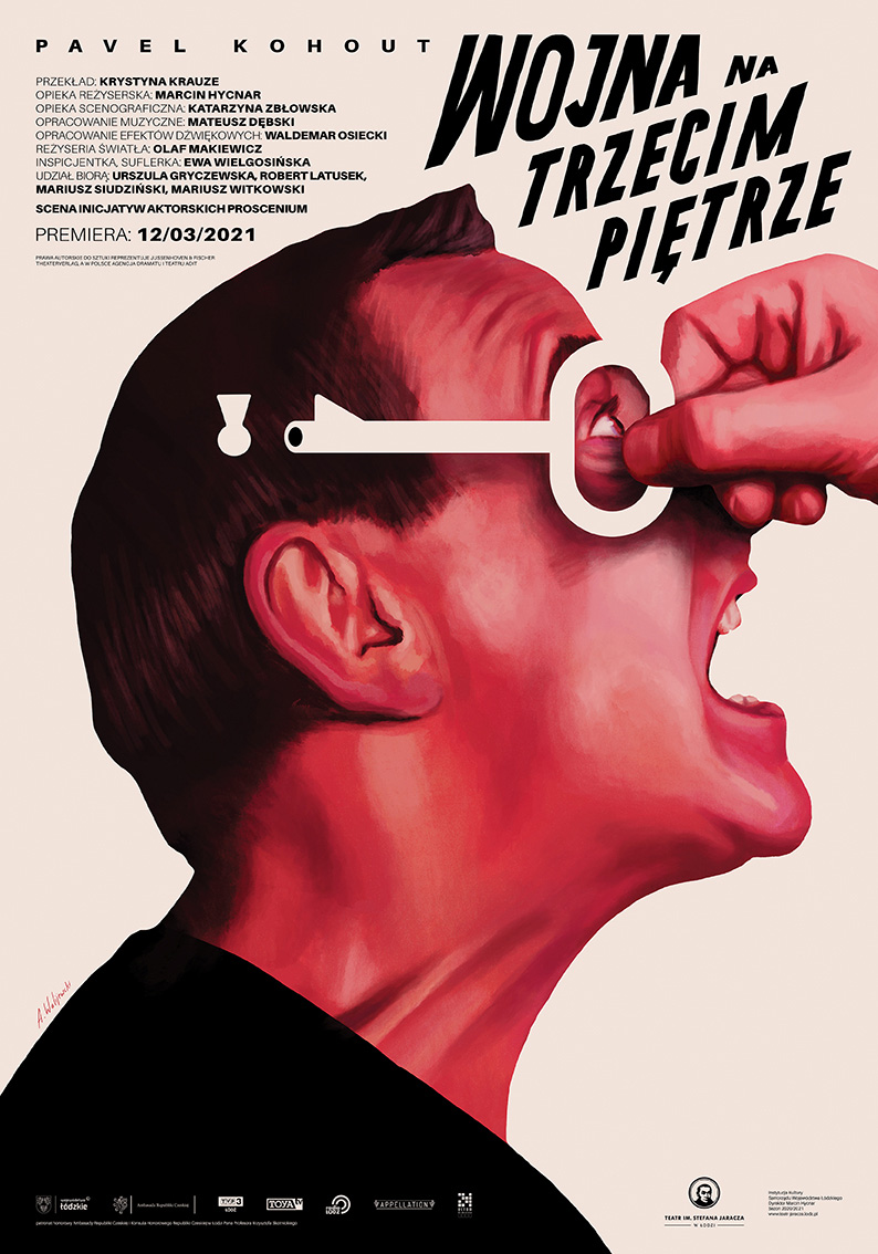 „Wojna na trzecim piętrze” – komedia Pavla Kohouta, znanego czeskiego dramaturga, prozaika i opozycjonisty – to spektakl, który powstał na Scenie Inicjatyw Aktorskich Proscenium. Nowy dyrektor, Marcin Hycnar, który podjął się opieki reżyserskiej w trudnych pandemicznych czasach, poprowadził aktorów zdecydowaną ręką. Stęskniona za teatrem publiczność dopisała. Z tego powodu w piątek 19 marca – w ostatnim dniu przed ponownym lockdownem – aktorzy zagrali aż dwa spektakle. Z trudem dostałam się na ten późniejszy termin i z radością pojawiłam się w teatrze, gdzie spora już grupka widzów spacerowała we foyer, czekając na przedstawienie. Dla Łodzian (i nie tylko – ja przyjechałam specjalnie z Warszawy) pójście do teatru to nadal wydarzenie i przyjemność. A Hycnar, który szefował już teatrowi w rodzinnym Tarnowie, wydaje się dobrze wyczuwać to, co mieszczańskiej publiczności może sprawić radość.