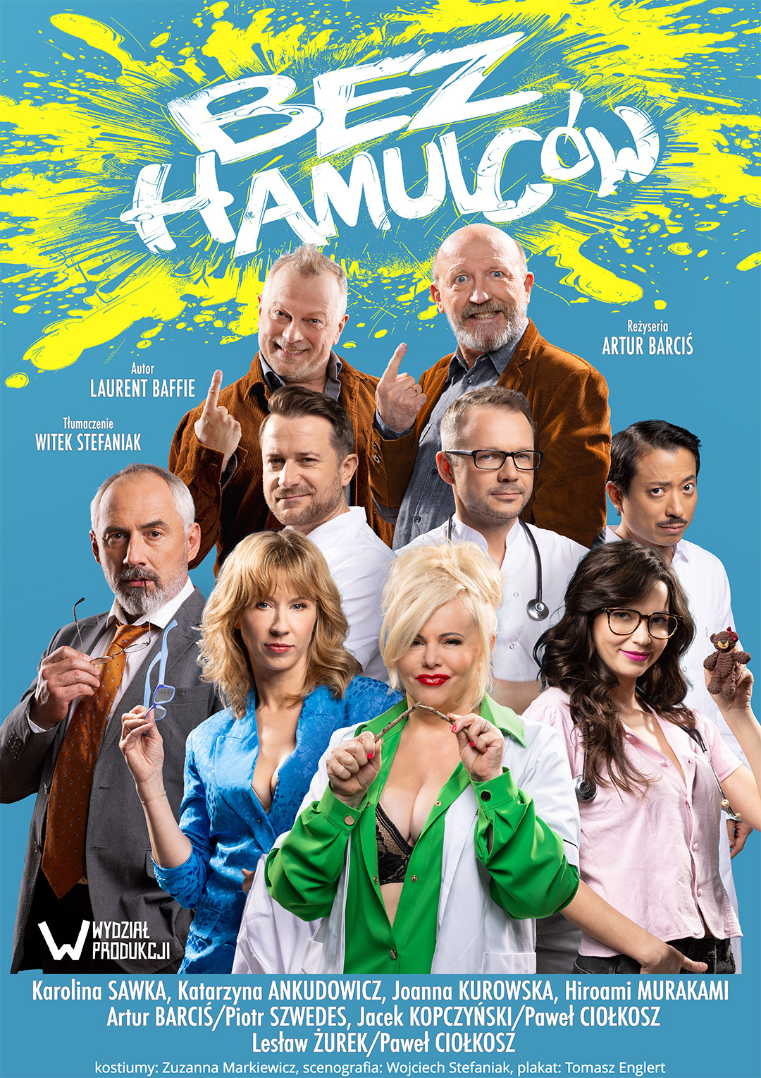Scenografia Wojciecha Stefaniaka nie pozostawia wątpliwości – przed oczami mamy klinikę. Z informacji wyświetlanych na monitorze telewizora wynika, że Fuksmed oferuje konsultacje psychiatry, neurologa, pediatry, krótko mówiąc, jesteśmy w dobrych rękach. I w zasadzie do scenografii ogranicza się realistyczna strona spektaklu. Od pierwszych chwil, gdy na scenę wchodzi psychiatra w przyciasnej kamizelce, kolorowej koszuli, spodniach w kratkę, żółtych skarpetkach i mokasynach, których nie powstydziłby się klaun (kostiumy: Zuzanna Markiewicz), wiadomo, że „Bez hamulców” to komedia, która ma śmieszyć także poprzez przesadę.