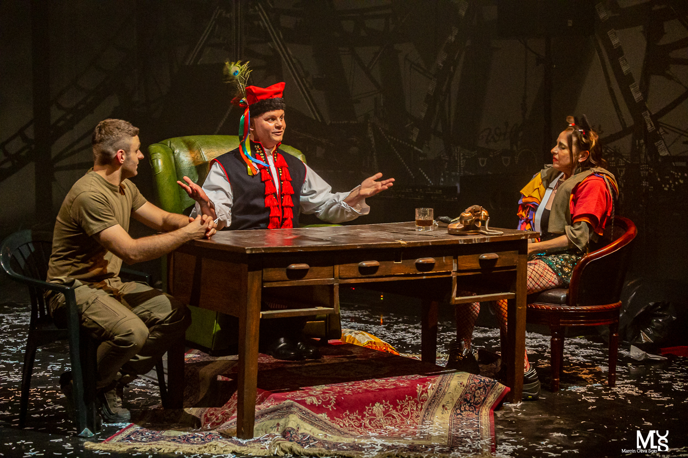 Osobną kwestią spektaklu jest Polska, którą utożsamia wzruszony działacz kultury Hołdzimierz Władyszłap Praszto (Piotr Sieklucki). Biegający po scenie w stroju ludowym, z siatami pełnymi darów dla potrzebujących, jest do bólu gombrowiczowski (a to duża sztuka!). Forma nienaganna, przecież każdy chce pomóc i chce się tym pochwalić na fejsie (a ekstrawagancki wolontariusz ma nawet okazję zrobić sobie selfie z samym prezydentem), ale – jak to z formą bywa – okazuje się być całkiem pusta w środku. Z ustami pełnymi staropolskich frazesów tak naprawdę bardziej przeszkadza, niż pomaga w walce. Z szablą na czołgi, znamy to już od czasów Wajdy. Sieklucki tworzy Polaka targanego sprzecznościami, człowieka z sercem na dłoni, ale pamiętającego wołyńskie krzywdy. To bardzo ciekawy temat do rozwinięcia, jak pogodzić teraźniejszą braterskość z dawnymi, nieprzepracowanymi krzywdami. Tu nie ma na to miejsca, bo też nie taka jest konwencja tego spektaklu, będącego w gruncie rzeczy mieszanką farsy i czarnej komedii.