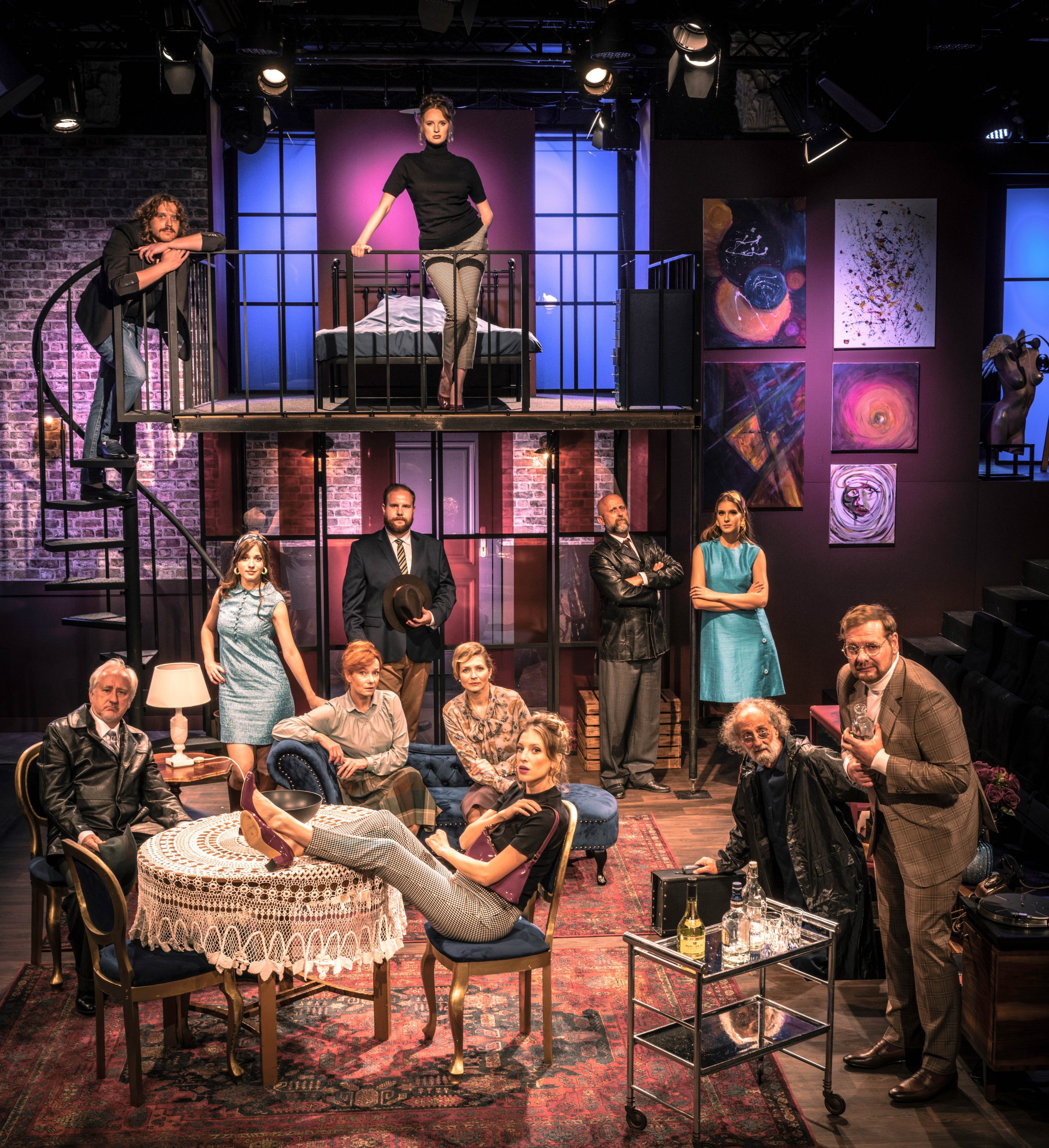 Pomimo że w większości momentów akcja rozgrywa się w ciasnej przestrzeni, tak by bohaterowie mieli jak najwięcej okazji do przypadkowych interakcji, czasem wykorzystuje więcej niż jedną przestrzeń. Umożliwia to scenografia projektu Katarzyny Wójtowicz, skonstruowana zgodnie z najlepszymi tradycjami szekspirowskimi. Podzielona jest ona na dwa plany, górny i dolny (ten ostatni wyposażono nawet w zapadnię). W ten sposób w charakterystycznej przestrzeni sceny Teatru STU udaje się otworzyć dodatkowy plan akcji, co pozwala wykorzystać bez sztuczności wszystkie zawiłości dramaturgiczne spektaklu.