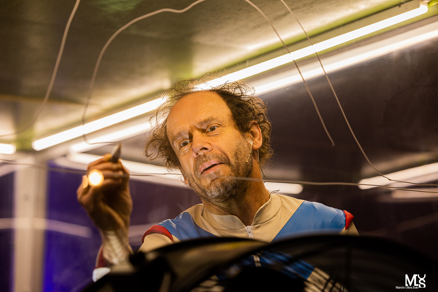 Scena składa się długiego wybiegu (pełniącego funkcję tunelu czasoprzestrzennego), który z jednej strony kończy się ścianą luster, z drugiej zaś sporych rozmiarów przeźroczystą kostką. W owej figurze przesiaduje Pilot (Tomasz Schimscheiner). Brodzący w plastikowych butelkach rozbitek, próbuje naprawić swój samolot. Skojarzenia z nadciągającą katastrofą klimatyczną każą myśleć o nieszczęśniku w plastikowym terrarium nie jak o człowieku, który uległ wypadkowi, ale jak o ostatnim człowieku na Ziemi w ogóle.