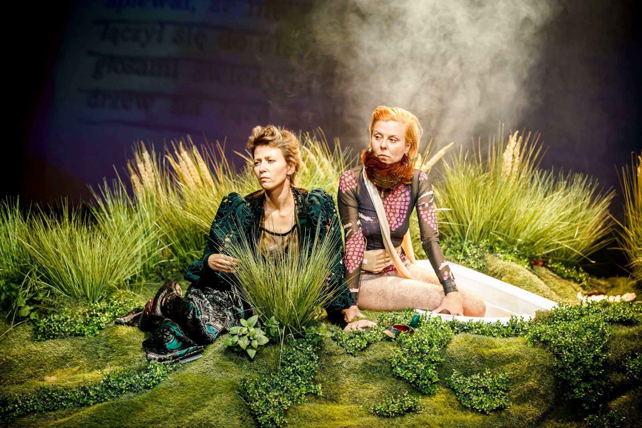 Inscenizacja przygotowana przez reżyserkę Magdalenę Miklasz i cały jej zespół jest w warstwie wizualnej dość zaskakująca. Scenograf – Tomasz Walesiak – na środku sceny stworzył romantyczną przestrzeń, która przypomina letnią łąkę z kwiatkami i bujną trawą. Takie pole działania jest wspomnieniem wiejskiego dzieciństwa bohaterki. Wypełnione zielenią terytorium to królestwo Klarysy (Agnieszka Roszkowska), obok niej na łące widzimy też postaci protagonistów – innych kobiet i mężczyzn. Do życia poszczególnych bohaterów powołuje Virginia (Anna Stela) – alter ego autorki powieści, która krążąc po całej scenie prowokuje ich i jakby łączy ze sobą. Kieruje i stymuluje tempo opowiadanej w przedstawieniu historii. Jest narratorem wydarzeń, o których mówi pani Dalloway. Dzięki Vrginii poznajemy wszystkich znajomych i przyjaciół z dzieciństwa głównej bohaterki. Ona staje się też powiernicą i mentorką Elżbiety, córki Klarysy. Krążąca jak meteor kobieta inicjuje także działania Septimusa (Marcin Wojciechowski) i Lukrecji (Weronika Krystek). Pokazuje ich zależności, a może nawet pogłębia chorobę psychiczną mężczyzny, bryluje również na przyjęciu wydanym przez Panią Dalloway.