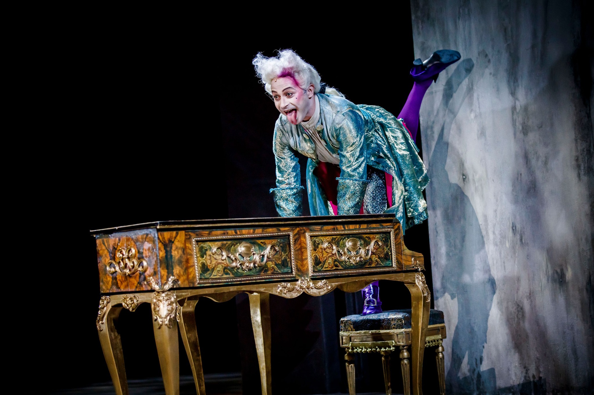 Biograficzne umocowanie, dotyczące konfliktu wokół rywalizacji dwóch kompozytorów, nie jest w tym utworze najważniejsze. I wie o tym Anna Wieczur (reżyseria), dla której tekst staje się przede wszystkim przyczynkiem do opowieści o dewastujących mechanizmach nienawiści, które rodzą się w sytuacji, kiedy jeden z protagonistów staje się świadomym(?) katem, a drugi nieświadomą ofiarą. Nienawiści odwołującej się również do metafizyki, jako że Salieri w swoich wyznaniach nie raz kieruje bluźniercze pretensje pod adresem wyroków boskich. Można się jednak zastanawiać nad tym, czy układ, jaki powstał między Salierim a Mozartem, w kontekście pretensji i zarzutów stawianych Bogu, czyni z pierwszego tylko samego sprawcę. Ta konfrontacja dwóch diametralnie odmiennych osobowości, dwóch różnych postaw i temperamentów w podejściu do życia i aktu tworzenia, w warszawskim spektaklu wybrzmiewa naprawdę przejmująco. Mamy w nim bowiem kreacje aktorskie, które na długo zapadają w pamięci, w rezultacie tworząc widowisko imponujące harmonią i zadziwiające teatralnością. Anna Wieczur potrafi efektownie, błyskotliwie i ze smakiem, przy tym szalenie naturalnie operować konwencjami, które w tym dramacie nawiązują również do elementów komediowo-farsowych. Nie traci jednak nigdy z oczu spoiwa stanowiącego kwintesencję dramatu, ogniskującego się wokół nieodwołalności tego, co wydarzy się w finale, a co zostało zdeterminowane desperackimi skargami kierowanymi przez Salieriego do Boga. Adam Ferency konsekwentnie wydobywa z tej roli całą rozpacz i bezradność bohatera, które powoli przeradzają się w bezkompromisowe pragnienie unicestwienia bardziej utalentowanego konkurenta. Wszystkie środki, które Ferency używa do konstruowania tej postaci, pozbawione maniery aktorstwa charakterystycznego w eksploracji znamion ludzkiej arogancji, bezceremonialności, gniewu, dążenia do zemsty i przeklinania losu, mieszczą się doskonale w przenikliwości czynu, do którego w swych działaniach zmierza. Aktor jest równie sugestywny jako osoba dramatu, jak i komentator scenicznej akcji, od momentu kiedy siedzi nieruchomo w fotelu wyznaczając widzom rolę arbitrów i obserwatorów, aż do chwili kiedy pojawi się w jego rękach samobójcza broń. Wcześniej, kiedy wygłasza swoje twórcze credo oddając się pełnej wyrzeczeń służbie dla boskiej chwały, która ma mu przynieść nieśmiertelność.