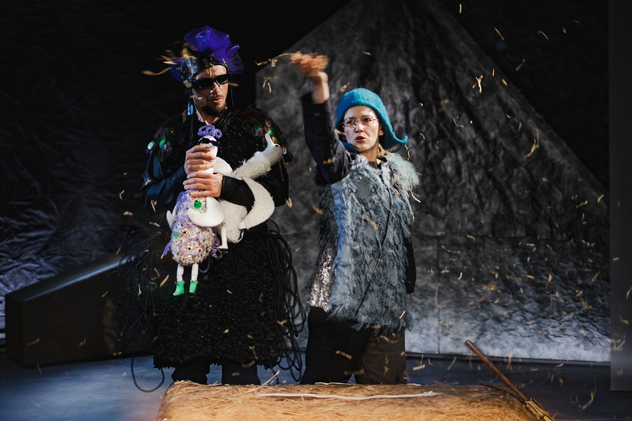„Kulawa kaczka symbolizuje osobę dość powolną i wyjątkowo nudną, ślepa kura z kolei to ktoś, komu dzięki szczęściu udaje się odnieść niespodziewany sukces” – wyjaśnił Ulrich Hub w wywiadzie, przed premierą. Obie bohaterki bywają nieszczere, a nie wynika to ze złej woli, raczej ze strachu, choć ostatecznie uczą się jak być sobą, przyznać do popełnianych błędów i nie bać się własnego zdania. Opowieść drogi zyskuje u Ulricha Huba nowe znaczenie, ulotne szczęście tkwi w rzeczach prostych i wcale nie jest tak nietrwałe, jak twierdzą inni. Wspólne pokonywanie trudów wędrówki może być wielką frajdą, zwłaszcza, gdy na końcu drogi stoją marzenia, gdy damy się ponieść przygodzie i zaufamy intuicji. Potrzeba tylko kropli odwagi i wiary we własne siły. Spektakl nie jest trudny w odbiorze, choć podejmuje niełatwą tematykę. Na scenie zwariowane ptaki, kaczka i kura, zmagają się z życiowym wyzwaniem, poznają smak przyjaźni i zaczynają rozumieć, czym jest współczucie oraz empatia. Dużo tu absurdu i groteski, która bliska jest dzieciom i w ciepły, przyjazny małym widzom sposób przybliża uniwersalne prawdy. W bezpiecznej przestrzeni teatru mali widzowie mogą zetknąć się z problemami znanymi nam z życia. Zderzenie dwóch różnych osobowości bawi, ale skłania też do przemyśleń. Wszystko to wplecione w bajecznie groteskową historię, pełną fantazji i błyskotliwego humoru. Autorzy spektaklu bawią się słowem, konwencją, łączą baśniowość z realnym życiem, styl znany z animowanych filmów dla dzieci z klasyką sceny. Różne formy teatralne przeplatają się ze sobą – teatr cienia, lalki i żywy plan. Dzięki temu najmłodsi widzowie jeszcze lepiej odczuć mogą magię i bogactwo tkwiące w scenicznej metaforze. Aktorzy – animatorzy nadają lalkom charakter, przykuwają uwagę i bawią publiczność. A czynią to z wdziękiem, zaskakując niesamowitą energią. Odtwórczyni roli kulawej kaczki, Anna Przygoda, od razu podbija dziecięce serca (i nie tylko dziecięce) – swą brawurą, uśmiechem i dojrzałą grą. Tomasz Kowol wciela się w ślepą kurę. Gra lekko i swobodnie, nieustannie wplątując swą bohaterkę w zabawne sytuacje. Żywiołowo, z odpowiednią dynamiką, dbając o niuanse i z niebanalnym wyczuciem sceny, aktorski duet opowiada swoją historię. W urokliwy sposób wykorzystuje barwny tekst, wartkie dialogi i szybko nawiązuje kontakt z dziećmi, które z zapartym tchem śledzą przebieg akcji, śmiejąc się i żywo reagując na szalone wybryki ptasich bohaterek. Chociaż spektakl adresowany jest do widzów od lat pięciu wzwyż, na widowni zasiadają również młodsi i z równym zainteresowaniem chłoną urok przygód kury i kaczki, wsłuchują się w piosenki – doskonale wkomponowane w całość, zabawne, pomysłowe i łatwo wpadające w ucho.