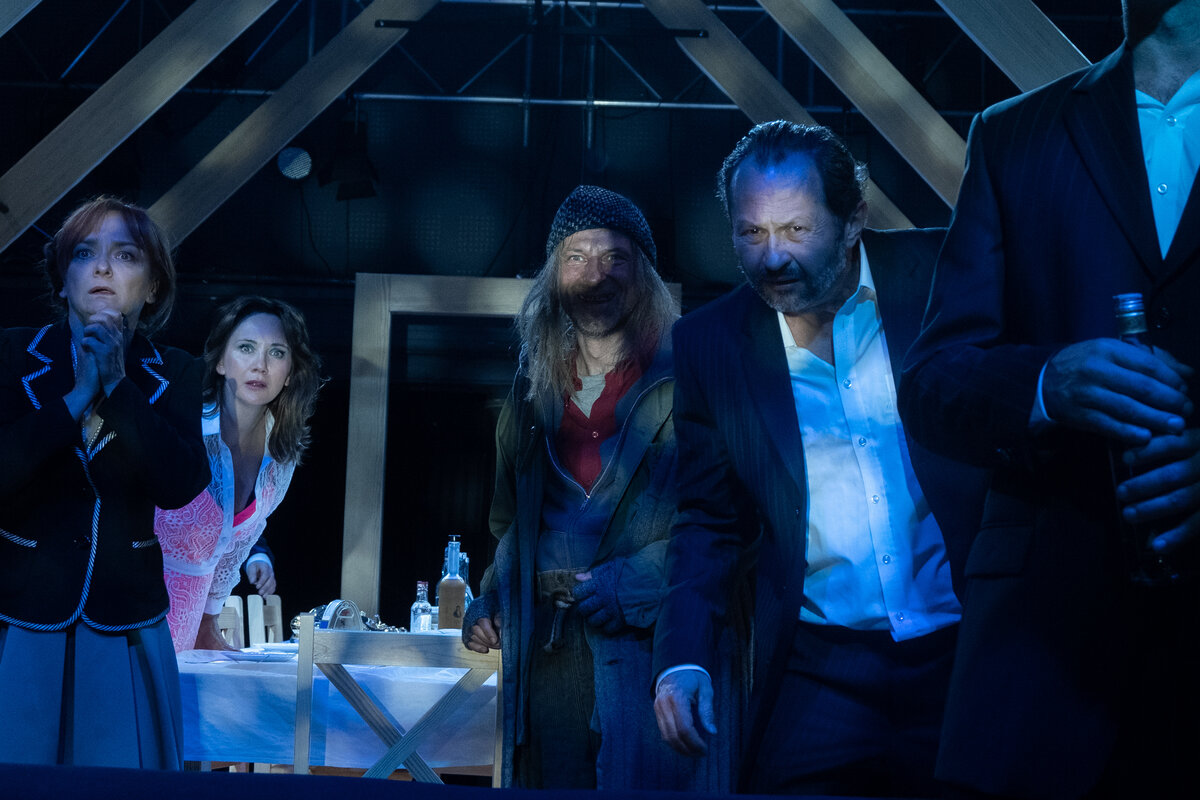 W „Big Bangu”, podobnie jak we wszystkich poprzednich inscenizacjach tego reżysera nawiązujących do prostych opowieści zakotwiczonych w lokalnych realiach, bardzo istotne jest mocne osadzenie historii w przestrzeni i w formie. Już samo otwarcie ochowego przedstawienia, z dość długą sceną działań Sławomira Packa (Mietek Wroński) i Izabeli Dąbrowskiej (Hela, żona Mietka), wyraźnie wskazuje na sensy, jakie przyjdzie nam rozczytywać i na samą dynamikę poszczególnych scen. Wszystkie postaci tej opowieści o przybyłych kosmitach i chęci ich powitania są od początku okonturowane mocno rozpoznawalną charakterystycznością. Sceniczna organizacja jak zawsze u Ratajczaka, także i w tym spektaklu, działa znakomicie. Rozbijana na fragmenty pojawiania się kolejnych bohaterów narracja bardzo dobrze spaja świat przedstawiany, wydobywając z niego to, co najbardziej ostre czy obsesyjne. Atmosfera jest cały czas intensywnie podsycana niepokojem, który z jednej strony jest czekaniem na wizytę niespodziewanych gości, którzy wylądowali na polu Mietka i Heli, z drugiej eskaluje wrażenie jakiegoś spętania czy usidlenia nieznanym, niewiadomym i nierozpoznanym. Przy okazji wychodzą też na jaw i inne zaplątania wynikające z codziennego życia w tak małej społeczności. Bohaterowie, niemal wszyscy ogarnięci pasją i zaciekłością (alkohol jeszcze te ich zapalczywość wzmoże), są zamknięci jak w klatce między długim stołem a wersalką i widokiem z okna na pojazd z przybyszami z innej galaktyki. Daje im to możliwość pokazania jak bardzo są nową sytuacją dotknięci, zarówno w perspektywie dosłownej, jak i umownej, a nam widzom pozwala stać się świadkami tego, co się dzieje.