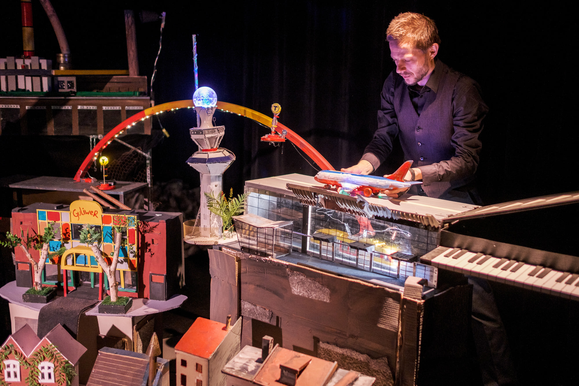 „City of Lights” to tylko jeden dzień w stolicy, za to jakże bogaty w treść, wrażenia, zapachy, smaki i rzecz jasna blask diod, elektryczności, latarni i sygnalizacji świetlnej. Tu nic nie jest martwe. Kameralna, malutka scena zamieniona została w ruchliwą, nigdy nie zasypiającą makietę miasta. Jej animatorami są znakomici aktorzy Teatru Guliwer – Elżbieta Pejko, Paweł Jaroszewicz i Maciej Owczarzak. To oni zapraszają dzieci do zabawy i nauki. Dzięki sprytnym rozwiązaniom scenograficznym udaje się odtworzyć charakter znanych miejsc i budowli. Widzowie rozpoznają Plac Zamkowy z Zamkiem Królewskim i Kolumną Zygmunta III Wazy, gmach sejmu, w którym toczą się burzliwe dyskusje (świetnie pokazane, choć bez użycia słów), mosty, lotnisko, dworzec kolejowy, szpital, sięgające chmur wieżowce i biurowce. Wydaje się, że rzeka z plastikowych korków zaraz popłynie żwawym nurtem. Z przyjemnością spoglądam na uroczą makietę Teatru Guliwer – w nim króluje magia i wyobraźnia, która doskonale pasuje do wielkomiejskiego otoczenia. Taksówką, samochodem, pociągiem możemy wybrać się w podroż do świata animacji, bliskich dzieciom form, zmysłowej, plastycznej zabawy skojarzeniem. A wszystko to łączy światło i dźwięk oraz muzyka autorstwa Marka Żurawskiego. Aktorzy – animatorzy w roli gawędziarzy znakomicie radzą sobie z niełatwym zadaniem – stąpają ostrożnie, czasem pośpieszniej wśród tekturowych, miniaturowych budynków, wprawiają w ruch rekwizyty, budują, przestawiają, nawet nucą. W ciekawy sposób przypominają przeszłość miasta – czas wojenny i bombardowanie miasta, a potem odbudowę zniszczonej stolicy. I nie sposób oderwać oczu od tej dynamiki, jakże odmiennej od tradycyjnej sztuki dramatycznej. Warszawa – znana i nieznana – malowana jest światłem, obrazem, emocjami, nawet humorem oraz dopracowaną muzyką. W kameralnej, przyjaznej maluchom przestrzeni aktorzy odgrywają swoistą pantomimę. Teatr formy i wielozmysłowej treści zaskakuje niczym sen, przemawia do małego widza pobudzając zmysły, potem trafia do wyobraźni i skłania do pomysłowych interpretacji.