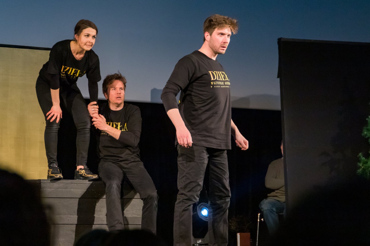 Bogata jest w tym spektaklu stylistyka aktywności aktorskiej. Poza tradycyjną teatralną robotą mamy tu i kabaret, i stand–up, i performance. Ogromną rolę w chorzowskich „Dziełach wszystkich Szekspira (w nieco skróconej formie)” odgrywa interakcja z publicznością, wymuszająca od aktorów gotowość improwizacji, bowiem trudno przewidzieć, jak zareaguje wyrwany do współdziałania widz. W zasadzie zaczyna się wszystko już w momencie, gdy publiczność zajmuje miejsca w sali (przedstawienie oglądałem na pokazie wyjazdowym w Ostrowcu Świętokrzyskim, rodzinnym mieście jednego z aktorów). Uważny widz mógł dostrzec kobietę w kraciastej chuście na ramionach, sprawdzającą okiem pani z „organizacji widowni”, czy wszystko jest w porządku. Jakiś czas później pojawia się na scenie jakby antreprener/konferansjer z informacją, że aktorzy, którzy mieli wystąpić nie dojechali, ale on nie pozwoli, by spektakl został odwołany. Zaczyna czytać z Wikipedii życiorys Williama Szekspira, który na skutek „samowolki” tableta miesza się z biografią… Hitlera, na co musi ingerować sam autor „Wesołych kumoszek z Windsoru”, mówiący głosem Adama Szymury (będzie on jeszcze kilkakrotnie ingerował w poczynania występujących na scenie). Po czym zapowiadacz ów zaprasza do udziału w widowisku rzeczoną kobietę w chuście i skrytego do tego momentu za zastawką obok widowni młodego mężczyznę, też wyglądającego na pracownika technicznego. Mistyfikacja szybko okazuje się inscenizacyjnym zabiegiem, a cała trójka, występująca pod prywatnymi imionami, to aktorzy Teatru Rozrywki w Chorzowie: Magdalena Wojtacha (profesjonalnie wytrwała do końca sztuki, mimo problemów z głosem po brawurowym wykonaniu rapu o Otellu), Marek Chudziński (to on grał przed „swoją” publicznością i dawał popis wszechstronnego talentu zwłaszcza w kobiecych rolach) i Jakub Wróblewski (rewelacyjny w każdym wcieleniu), którzy też wspólnie to widowisko wyreżyserowali (premiera odbyła się 12 marca 2021 roku). Grają role niekoniecznie zgodne z ich płcią, sprawnie zmieniają (z pomocą prawdziwych „technicznych”) kostiumy (obmyśliła je, podobnie jak i minimalistyczną acz pomysłową scenografię, Magdalena Wiluś), śpiewają, (oryginalną muzykę skomponował Kamil Franczak), swobodnie wchodzą w interakcję z widzami. Doskonale odnajdują się w pastiszowo–groteskowo–absurdalnej konwencji, przez cały czas utrzymując żywe, dynamiczne (choć nie od początku spektaklu) tempo przedstawienia, nie pozwalając widzowi na nudę czy dłuższe wytchnienie od śmiechu.