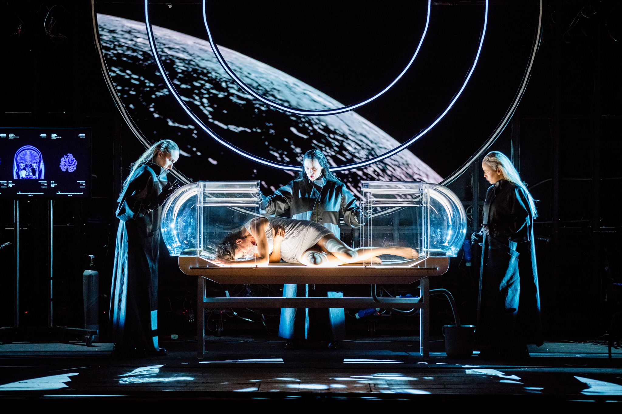 Przygotowując się do wizyty w Teatrze Wielkim, zapoznałem się z kilkoma inscenizacjami oraz analizami tego tytułu dostępnymi na portalu YouTube. W większości dominowały elementy klasycznego kostiumu: pióra, cekiny, tiule, loczki, bogate stroje oraz fryzury stylizowane na średniowieczne, budujące atmosferę swoistej „ramoty”. W warszawskiej inscenizacji mamy do czynienia z zupełnie innym podejściem – opowieść nabiera charakteru science-fiction, z elementami horroru, pełna jest komputerowych wizualizacji, technicznych hybryd człowieka i maszyny, a także futurystycznych krajobrazów.