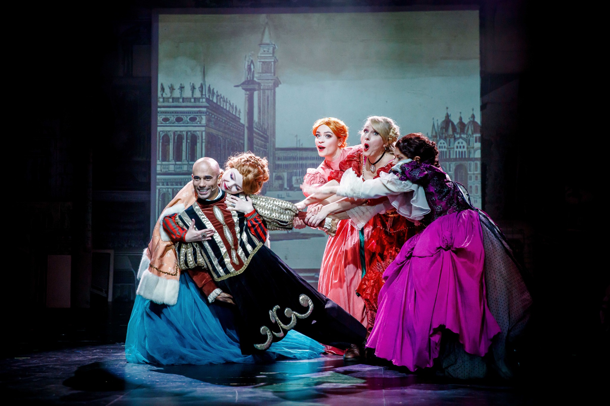 Do dzisiaj zastanawiam się dlaczego tak się stało tym razem, albowiem dotychczasowe przedstawienia widziane na Litewskiej (no może poza “Kajko i Kokosz. Szkoła latania”) to były prawdziwe wydarzenia, zachwycające feerią barw, wokalnymi fajerwerkami, cudowną rozrywką, którą niosła udana dramaturgia, świetna muzyka i dobre aktorstwo. W „Czarnym Szekspirze” jedynym przyciągającym uwagę aktorsko-wokalnym punktem jest Przemysław Glapiński, który nawet walcząc z zakłóceniami technicznymi potrafił utrzymać przez dłuższą chwilę w ryzach sceniczne wydarzenia. Niestety jego rewelacyjnie zaśpiewany song nie jest w stanie przykryć niedoskonałości wokalnych reszty zespołu, i to zarówno tytułowej postaci, w którą wciela się Mikołaj Woubishet, jak i zespołu żeńskich rewolucjonistek. Tych potknięć intonacyjnych podczas premiery było naprawdę sporo. I nie zdołały ich zrekompensować ani ciekawie pomyślane kostiumy Katarzyny Adamczyk, ani też udana scenografia Grzegorza Policińskiego.