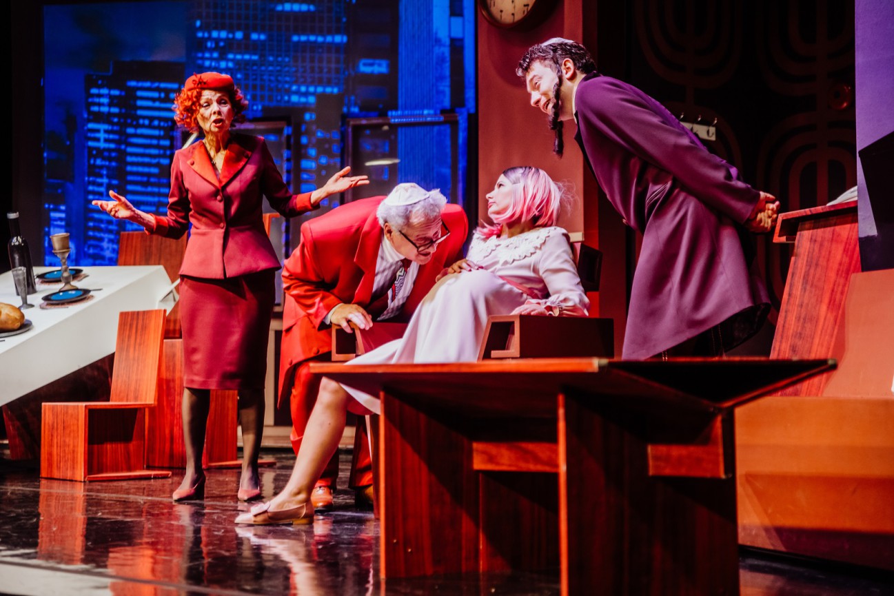 To prosta historia o dziewczynie, która wprowadza swoich rodziców w błąd na temat przynależności religijnej swojego chłopaka, więc wynajmuje modela z agencji, żeby tę właściwą – zgodną z wolą rodziców – “koszerność” pokazał. Wynajęty młodzieniec tak dobrze “wchodzi” w postać, że się w zleceniodawczyni zakochuje, a ona w nim, w rezultacie zakładają rodzinę. Można by z całą pewnością rzec, że to świetny temat na zabawną farsę czy udaną komedię, ale, niestety, nic z tym dobrego nie zrobiono, bo większość czasu poświęcono na kolacyjne toasty, dziwne pozy i sytuacje przy światłach stroboskopowych, mające imitować tańce i dobrą imprezę. Stroboskopy nie świecą jak stroboskopy, tylko jak zwykłe sceniczne światła, więc te wykrzywione w półmroku aktorskie ciała wyglądają co najmniej dziwnie, by nie rzec fatalnie. Już sam podział przedstawienia jest kuriozalny: pierwsza część trwa półtorej aktu z przerwą i wlecze się niemiłosiernie. Wedle zapowiedzi w programie, spotkania rodzinne, których stajemy się świadkami, to ważne uroczystości w religii żydowskiej. Mamy więc stół, wino, a właściwie mnóstwo wina, czulent, chałkę i szabasowe świece. Zapowiedziano trzy różne obrządki świąt, ale ja nie zauważyłem między nimi różnicy, a jakaś przecież naprawdę istnieje? Bo chyba nie chodzi wyłącznie o wznoszenie toastów „Lechajim” czy „Mazel tov”, jak pokazano na scenie Kwadratu?