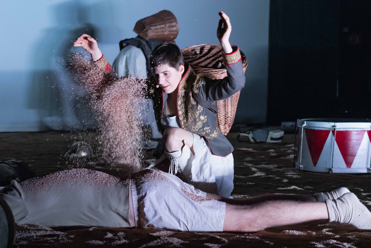 Scenografia spektaklu składa się z dwóch głównych elementów: ogromnego ekranu, na którym wyświetlana jest projekcja spokojnego, kołysanego falami morskiego brzegu oraz z ogromnej piaskownicy, wypełniającej prawie całą przestrzeń sceny. Pośród miliardów ziarenek piasku majaczy krajobraz jak po bitwie – tu i ówdzie leży hełm, zniszczona zbroja, kilka wojskowych werbli. Pomiędzy przedmiotami leży trzech (wyrzuconych na brzeg?) mężczyzn. Zanim jednak ockną się i zaczną debatować o rewolucji, życiu, śmierci i wielu innych kwestiach ostatecznych, widzimy przechadzające się po scenie dwie markietanki (Agnieszka Judycka i Magdalena Osińska). Kobiety nucą jedną z popularnych wśród cywilów wojennych piosenek, jakie śpiewano np. na ulicach Warszawy.