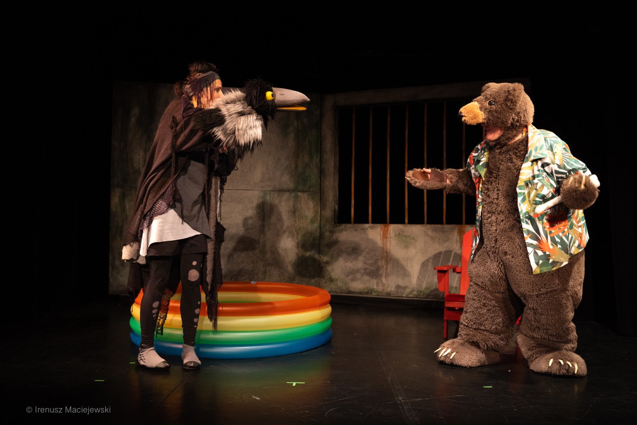 Przyjaźń Niedźwiedzia i Wrony zacznie się od nieszczęścia. Próbując ukraść kość z otoczonego betonowym murem wybiegu, Wrona (Dominika Miękus) wpada do basenu w barwach tęczy znajdującym się na niedźwiedzim „domu” (scenografia: Natalia Krynicka). Niedźwiedź (Andrzej Słowik) uratuje ją przed utonięciem, tyle że nie z dobrego serca, ale dlatego, że nie może już znieść jej krzyków. Zrzędliwy lub milczący krąży po swym szarym wybiegu marząc tylko o wolności. A ten zuchwały ptak jest wolny i może w każdej chwili pofrunąć dokąd chce! Tego faktu Niedźwiedź nie może znieść najbardziej, dlatego na „zaloty” Wrony reaguje niegrzecznie i lekceważąco. Można podejrzewać, że jest w depresji i ten stan jego umysłu reżyserka chciała zaakcentować w swym spektaklu tak czytelnie, że apatia Niedźwiedzia odciska niestety piętno na tempie akcji. Dzień i noc, dzień i noc – monotonia egzystencji Niedźwiedzia, z jednomiarowymi projekcjami (multimedia: Klaudia Pietrzak) i syntezatorową muzyką Bartłomieja Alberskiego sprawiają, iż dziecięca widownia, wychowana na migających obrazach, zaczyna niecierpliwie wyczekiwać nowych zwrotów akcji.