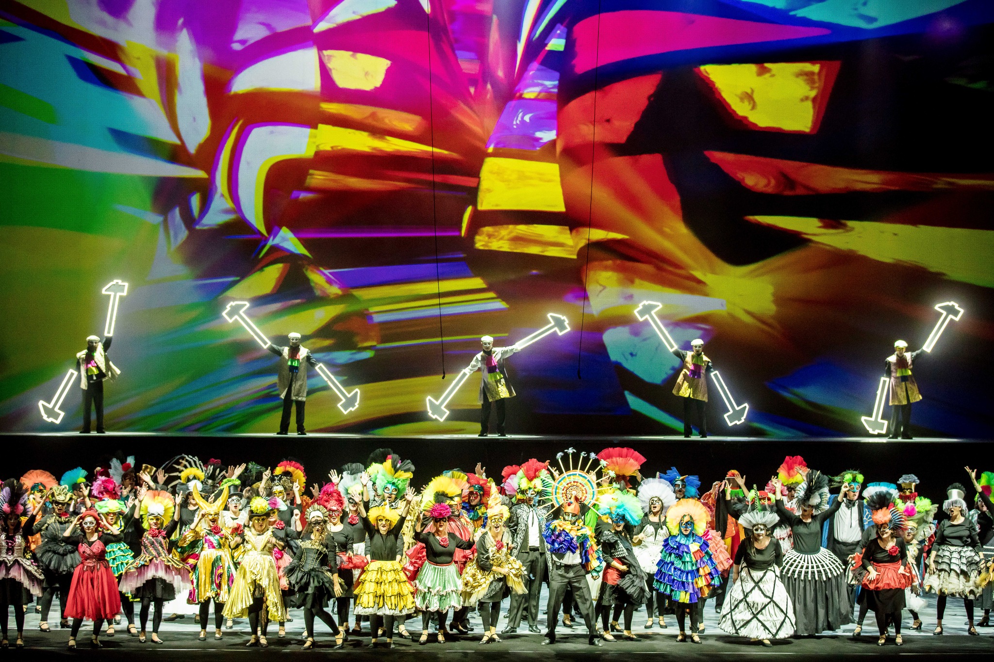 Jere Erkkilä, który już wcześniej swój zamysł wraz z Patrickiem Fournillierem (dyrygent) i Anną Kontek (scenografia i kostiumy) zrealizował w Fińskiej Operze Narodowej w Helsinkach, postanowił całość spektaklu wypełnić partiami chóru z popularnych oper Pucciniego, Verdiego, Bizeta, Leoncavalla, Mascagniego, Wagnera, Szymanowskiego i Moniuszki, ale sięgnął również po fragmenty z Carla Orffa („Carmina Burana”) i Krzysztofa Pendereckiego (VII Symfonia Siedem bram Jerozolimy). Mogłoby się wydawać, że taki scenariusz złożony z fragmentów różnych dzieł, napisanych w wieku XIX i XX, a zatem w estetyce muzycznej trudnych do zainscenizowania podczas jednego wieczoru, jest zadaniem na tyle karkołomnym, że w efekcie przynieść może coś na kształt zestawu na siłę połączonych utworów nie dających się spiąć w spójną konwencję i stylistyczną jednorodność. Tymczasem na wielkiej scenie Teatru Wielkiego – Opery Narodowej udało się bardzo prostymi i naturalnymi środkami uzyskać efekt, który pozwala na płynne przechodzenie z jednej sekwencji do drugiej, bez wrażenia jakiejkolwiek sztuczności czy poszukiwania najbardziej spektakularnych czy atrakcyjnych rozwiązań inscenizacyjnych. Wykonawcom wystarcza niekiedy tylko drobny element kostiumu (choćby płachta materiału czy kolorowa halka nakładana na bazę) czy też rekwizyt (wachlarz), by stać się tłumem Cyganów z „Trubadura” już za chwilę wiwatującym w „Carmen” na cześć pochodu torreadorów i zbliżającej się corridy. Oczywiście niektóre sekwencje wymagają zmiany kostiumów, jak choćby ta ze „Strasznego dworu”, kiedy w akcie IV, w finale, biesiadnicy już w kontuszach ruszają do skocznego mazura. Udało się też połączyć, bez jakichkolwiek zgrzytów, poszczególne sceny pod względem nastroju, choćby wtedy gdy bezceremonialne zachowania z „Latającego Holendra” matrosów trzeba zastąpić już tylko poważnym tonem w „Magnus Dominus et laudabilis nimis”.