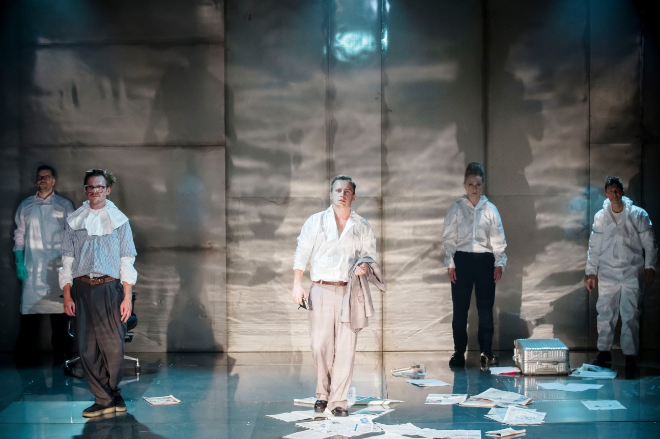 W atmosferę mającej nastąpić za chwilę teatralnej rzeczywistości wprowadza scenografia Mirka Kaczmarka (odpowiada on również za kostiumy i świetną reżyserię światła), którą ze względu na brak kurtyny widzowie mogą oglądać już podczas oczekiwania na pojawienie się aktorów. Na scenie mamy pięć foteli na kółkach, potem pojawi się walizka z kombinezonami ochronnymi i plik gazet publikujących dane o szerzącej się zarazie, rozrzuconych na przestrzeni całej sceny. Wyłożona pleksiglasem podłoga nadaje miejscu akcji charakter laboratorium, sali szpitalnej, tudzież prosektorium. Na ścianach w projekcjach pojawiają się daty, godziny i dane o liczbie osób dotkniętych chorobą lub przez nią uśmierconych. Ze sceny zaś padają słowa przedstawiające historię przebiegu dżumy od momentu znalezienia zdechłego szczura przez doktor Rieux (w tej roli Joanna Kasperek znakomicie oddająca wewnętrzne rozdarcie bohaterki, jedynej bodaj spośród całego grona świadomej zagrożenia, jakie niesie zaraza i starającej się stawić czoła poglądom innych osób na całą sytuację, mając jednocześnie z tyłu głowy lęk o siebie i swoją żonę), poprzez jej rozwój, kolejne ofiary, po zamknięcie miasta aż do ustąpienia zarazy, co nie zmniejsza obaw o przyszłość przysłaniających początkową euforię i nadzieję na normalność.