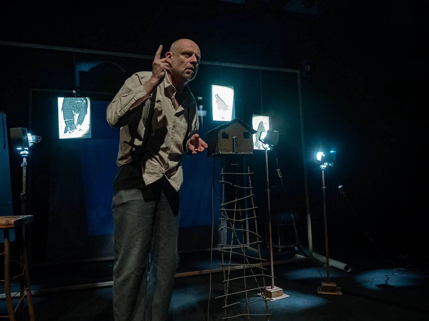 Na scenie widzimy tylko jedną postać – samego Krzysztofa Zemłę. Jego obecność na wysokim stołku wśród rzutników przypomina opowieść przy ognisku – pełną zadumy, skupienia i delikatności. Każde zdjęcie to punkt wyjścia do rozmowy o codzienności – wronach, płotach, koniach, ludziach – i o tym, co niedostrzegalne na pierwszy rzut oka: o przemijaniu, samotności, tęsknocie, o smutku, który „zawisa nad światem”. Ich połączenie – obrazu ze słowem – tworzy przestrzeń do refleksji, prostą, ale głęboką i poruszającą.